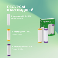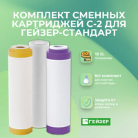 Комплект картриджей Гейзер С-2 предназначен для замены исчерпавших свой ресурс картриджей в стационарных трехступенчатых фильтрах для жесткой воды. Признаки жесткой воды: накипь белого цвета в чайнике, белый налет на сантехнике, пленка в чае. Используется в системе Гейзер: Стандарт (для жесткой воды) Так же совместим с другими трехступенчатыми системами Гейзер и системами других производителей стандарт 10SL (Slim Line). Состав комплекта С-2: 1-я ступень (картридж PP 5 мкр.). Ресурс 10000 литров. 2-я ступень (картридж БС). Ресурс 6000 литров. 3-я ступень (картридж БАФ). Ресурс 12000 литров. Назначение комплекта картриджей: 1-я ступень (картридж PP 5 мкр.). Механическая фильтрация. Эти картриджи применяются в бытовых фильтрах для очистки воды от грязи, взвешенных частиц и нерастворимых примесей. Этот недорогой картридж первым принимает удар на себя и защищает последующие ступени системы очистки воды от быстрого загрязнения. В условиях возможных грязевых выбросов в водопровод это простой и эффективный способ защиты картриджей тонкой очистки для бытовых фильтров для воды. Вышедший из строя картридж механической очистки быстро и просто заменяется, зато остальные фильтроэлементы работают дольше и с максимальной эффективностью. Картридж Изготовлен из вспененного полипропилена. 2-я ступень (картридж БС). Предназначен для удаления из воды избыточных солей жесткости на ионообменной смоле пищевого класса. Гарантирует отсутствие осадков и накипи на нагревательных приборах. Способность к удалению солей жесткости ионообменной смолы восстанавливается после простой регенерации раствором поваренной соли. 3-я ступень (картридж БАФ). Предназначен для очистки питьевой воды и может быть использован как одноступенчатый фильтр, так и в составе тройки на 2-ой и 3 –й ступени. Эффективно удаляет: твердые частицы, хлор, хлорорганические соединения, бензол, фенол, органические соединения, нефтепродукты, пестициды, железо, медь, марганец, ртуть, ионы тяжелых металлов, мутность, цветность, неприятные привкусы и запахи, бактерии и вирусы определенного ряда и др. Основное предназначение очистка воды от остаточного хлора, органических соединений и железа при содержании до 2 мг/л. Универсальный картридж – сохраняет эффективность при среднесуточном потреблении воды 7л на протяжении 300 дней и имеет ресурс эксплуатации без забивания -12 000 л.