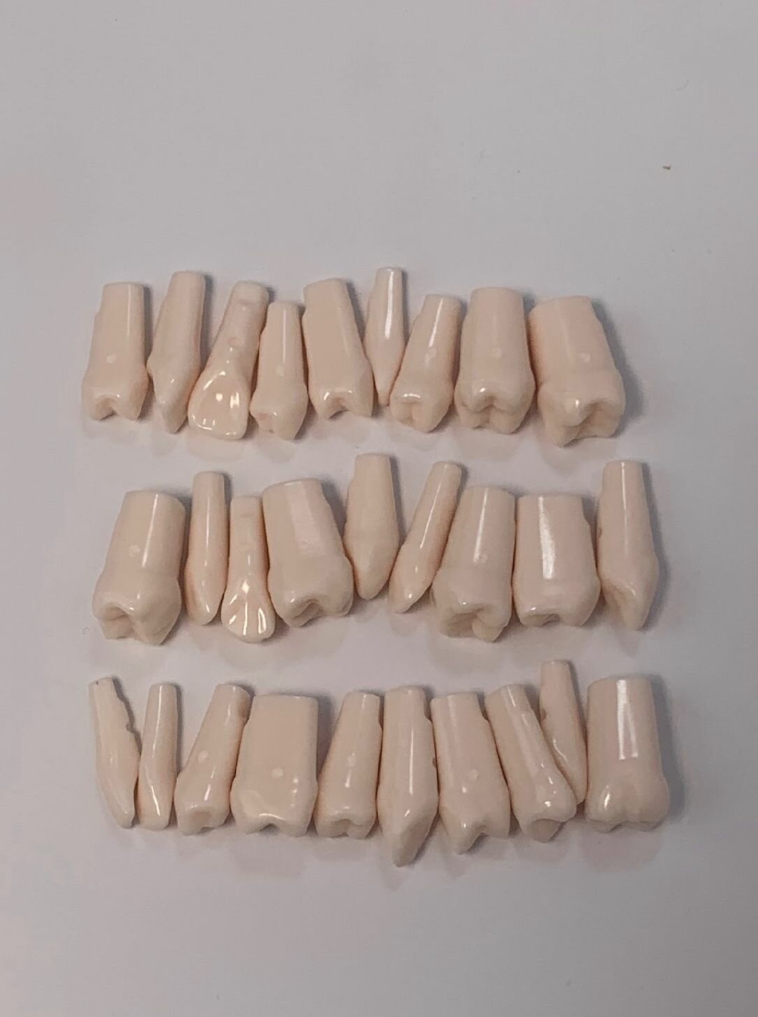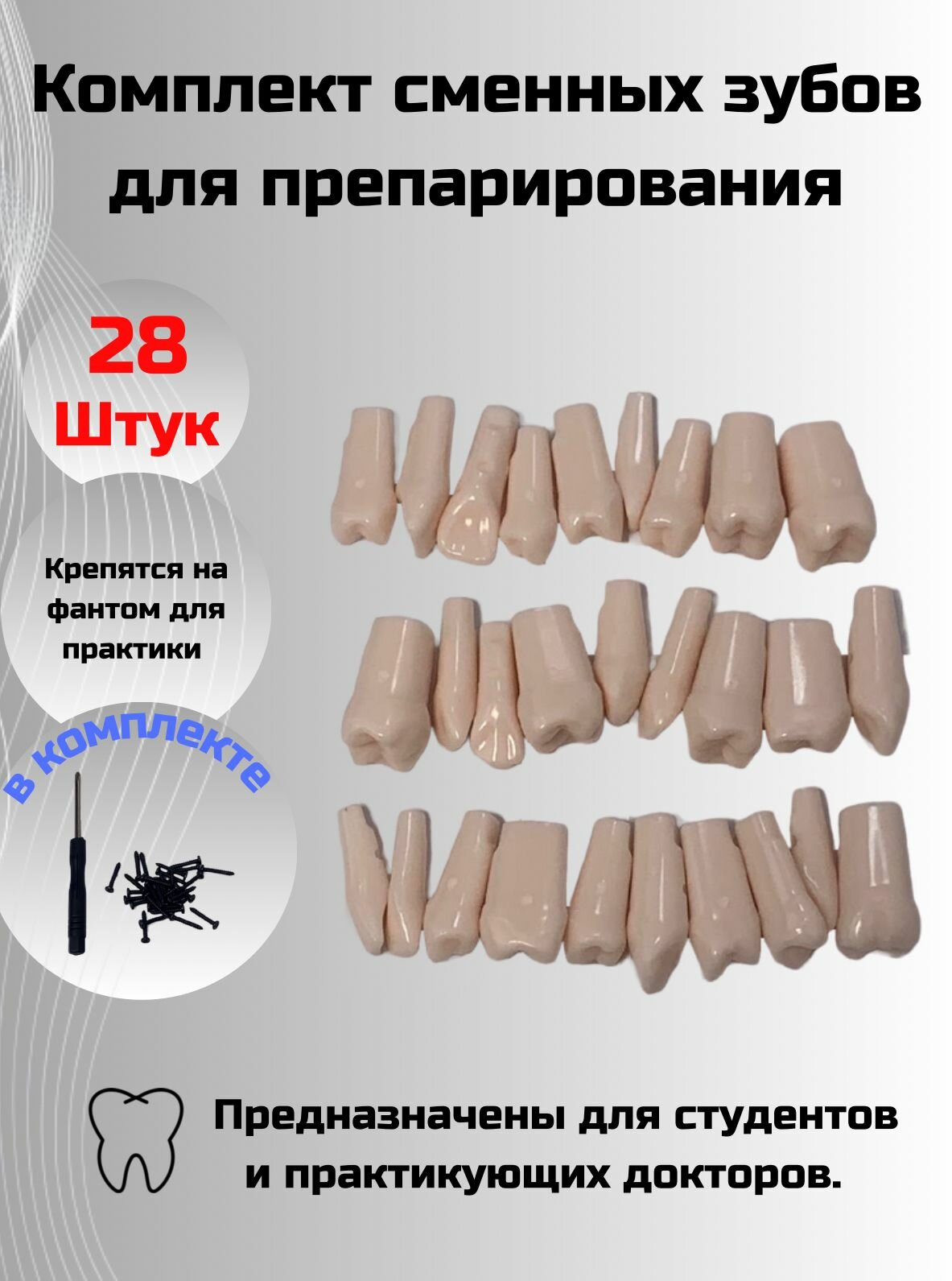 Комплект зубов крепится на тренировочный фантом. Сменные зубы имеют естественную форму, устанавливаются с помощь винтов Изготовлены из синтетической смолы, они отлично подходят для препарирования.