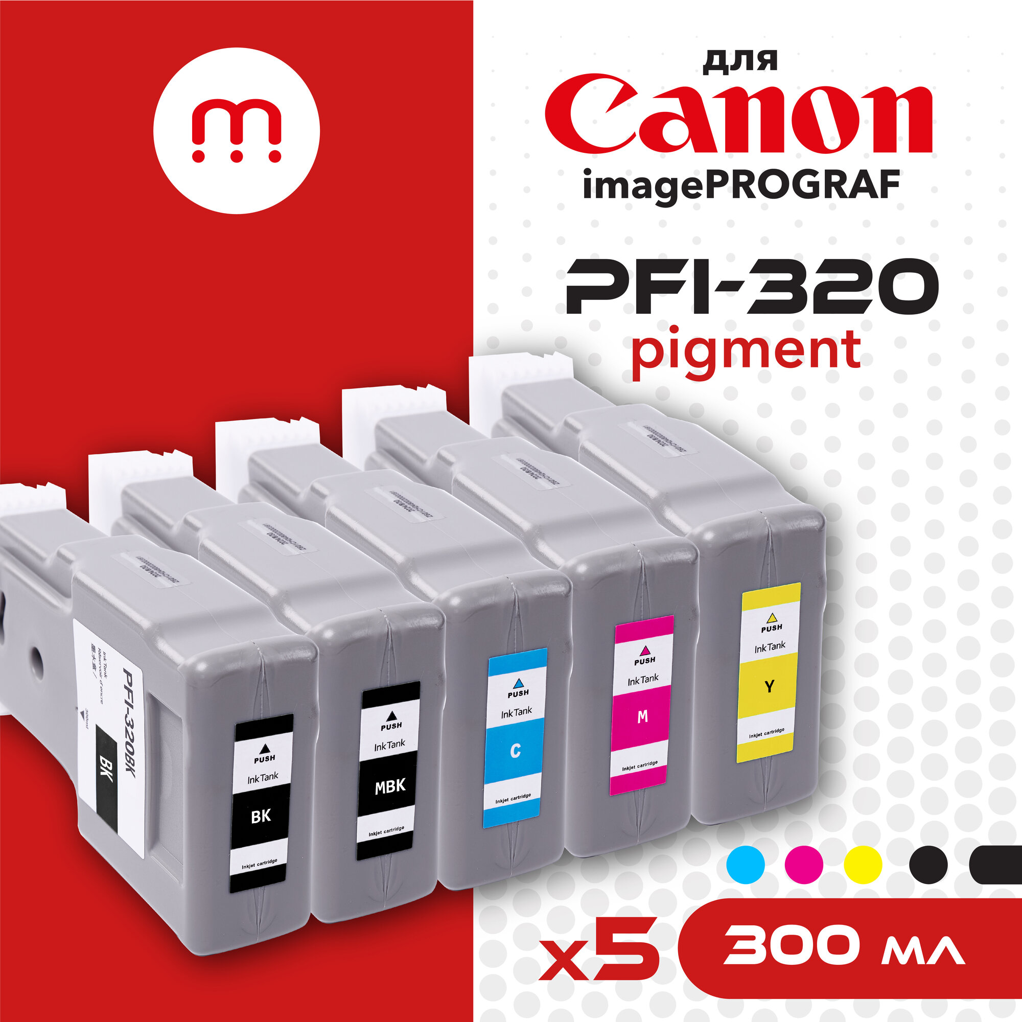 Комплект совместимых струйных картриджей PFI-320 (MBK, BK, C, M, Y), объём каждого 300 мл, пигментные чернила.