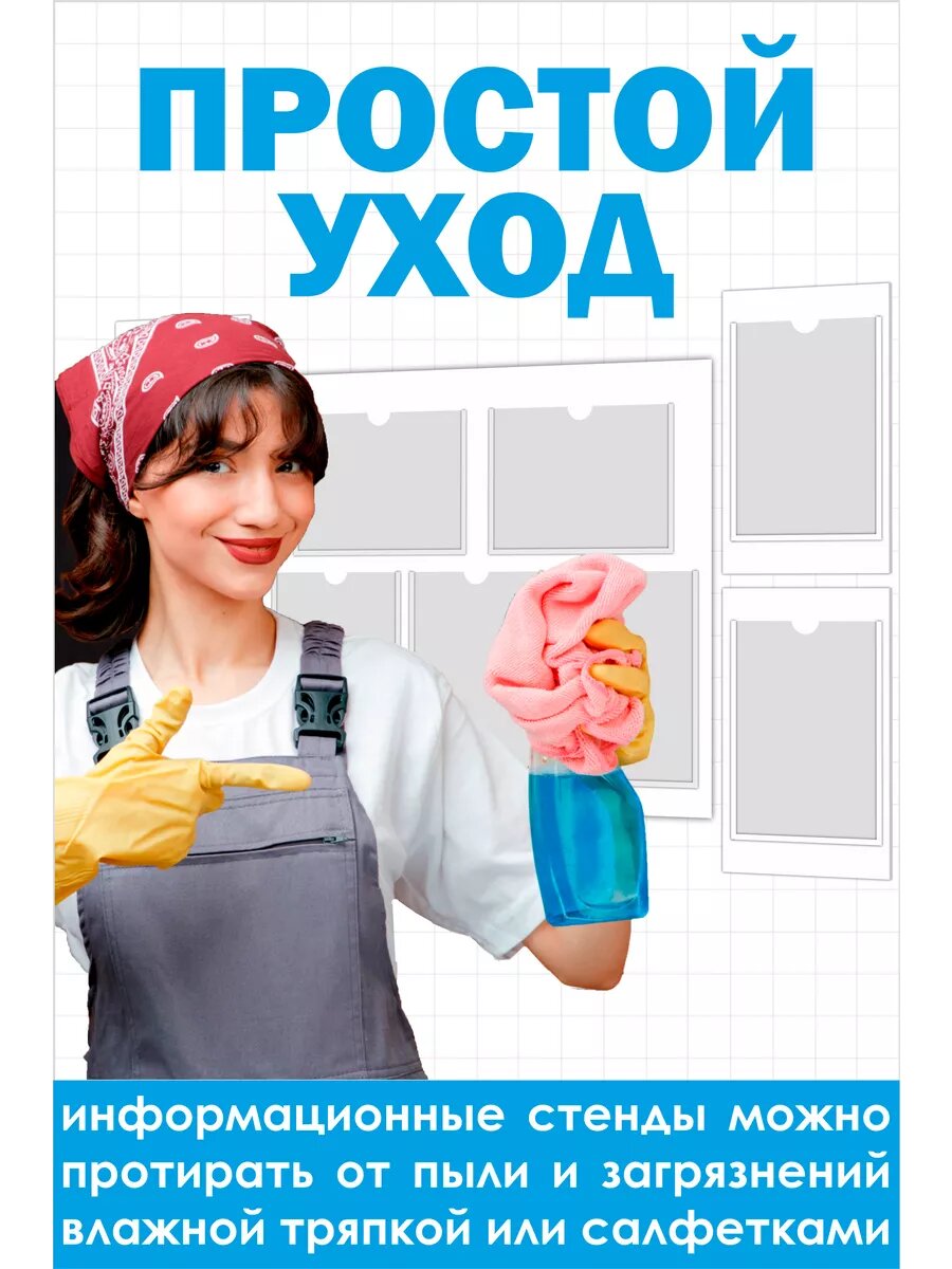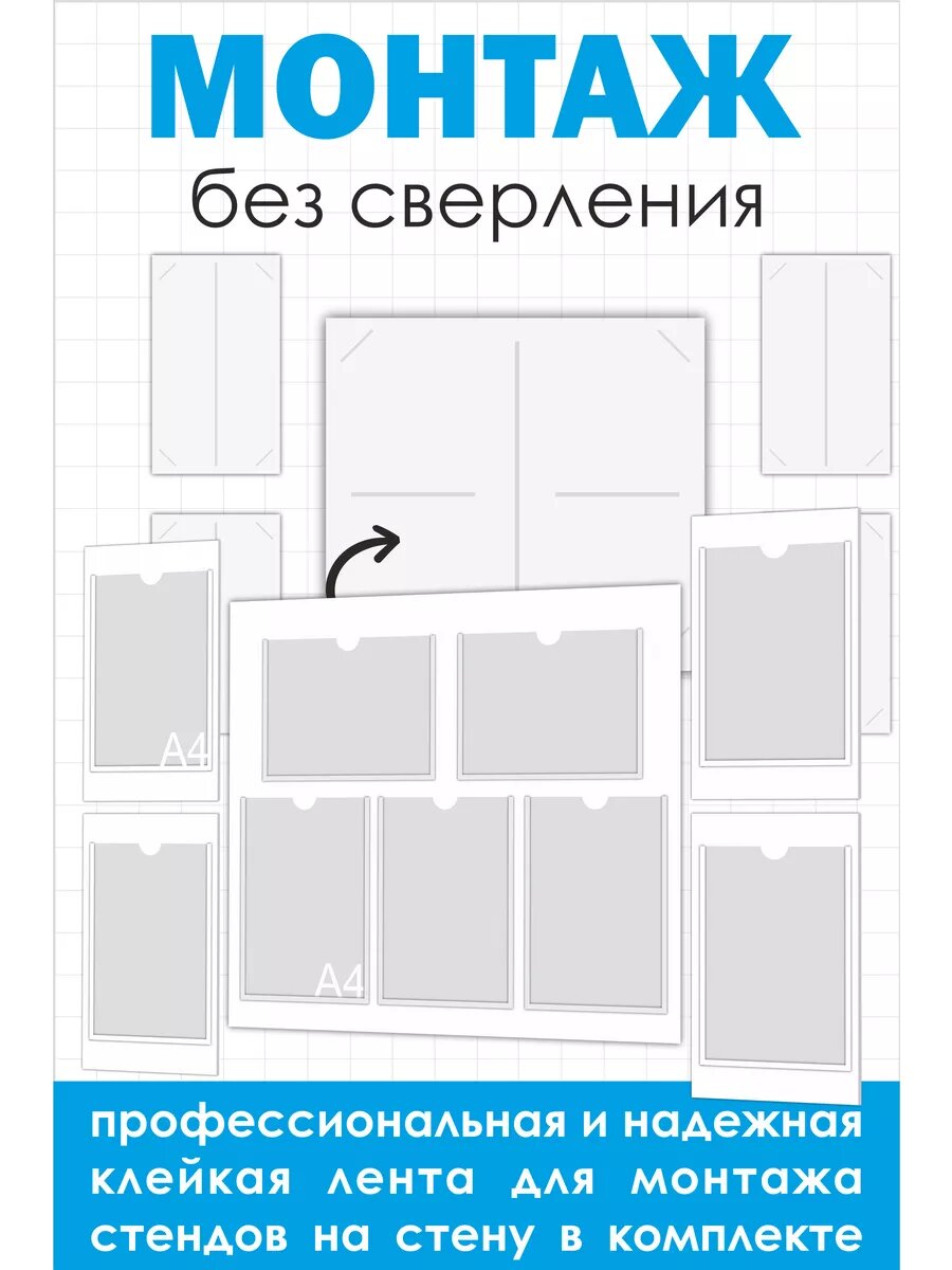 Комплект универсальных информационных стендов — идеальное решение для школы, детского сада и офиса! Качественный современный дизайн и отсутствие надписей позволяет самостоятельно выбирать и изменять информацию, делая стенд максимально адаптируемым под конкретные нужды. Оптимальное количество карманов обеспечивают достаточное пространство для размещения разнообразных материалов и постоянного обновления информации. Набор состоит из 5 стендов: основной имеет размер 75*65 см и 4 вспомогательных стендов-карманов А4 размером 25*40 см каждый. Материал конструкции стенда для школы: ПВХ пластик белый - прямая УФ печать. Материал карманов: ПЭТ 0,5 мм прозрачный. Уголок для класса устойчив к влаге (при необходимости можно мыть). В комплекте идет двусторонний скотч для монтажа стенда к стене (не требуется просверливать отверстия для монтажа).