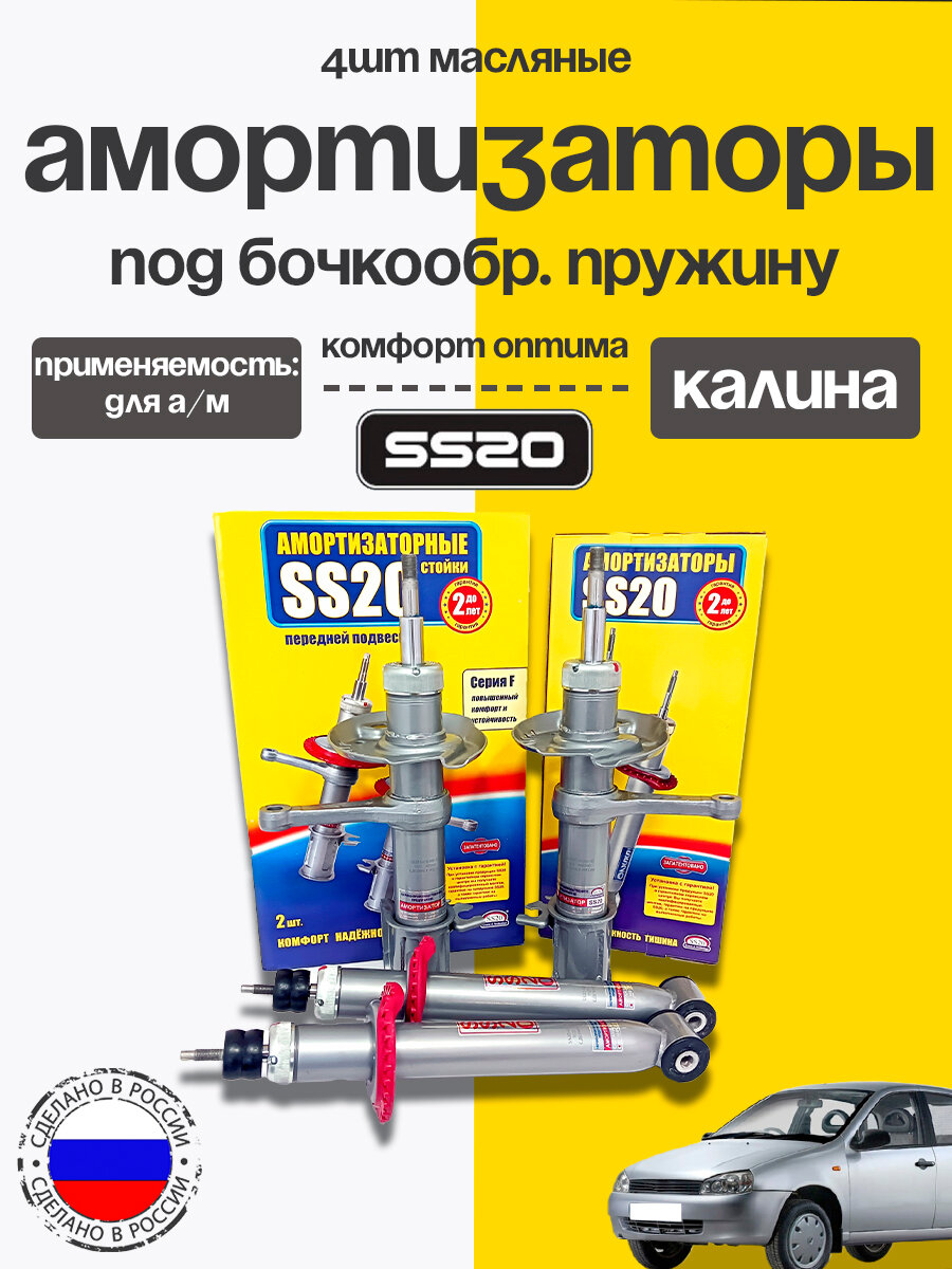 Комплект из 4 шт: 1. Амортизаторная стойка передней подвески под бочкообразную пружину SS20.41П/Л.00.000-02 Комфорт оптима для а/м ВАЗ 1119 Комплект 2шт. 2. Амортизаторы задние 2шт SS20 ВАЗ 2110, 2111, 2112, 1117, 1118, 1119 Комфорт оптима. Применяемость: ВАЗ 1117, 1118, 1119. «Комфорт оптима» — оптимальное решение как для спокойной, так и активной езды по городу и трассе, со сбалансированным сочетанием плавности хода и управляемости (по сравнению со «стандартом» увеличена энергоемкость, улучшена управляемость и снижены крены в поворотах). Производитель: SS20