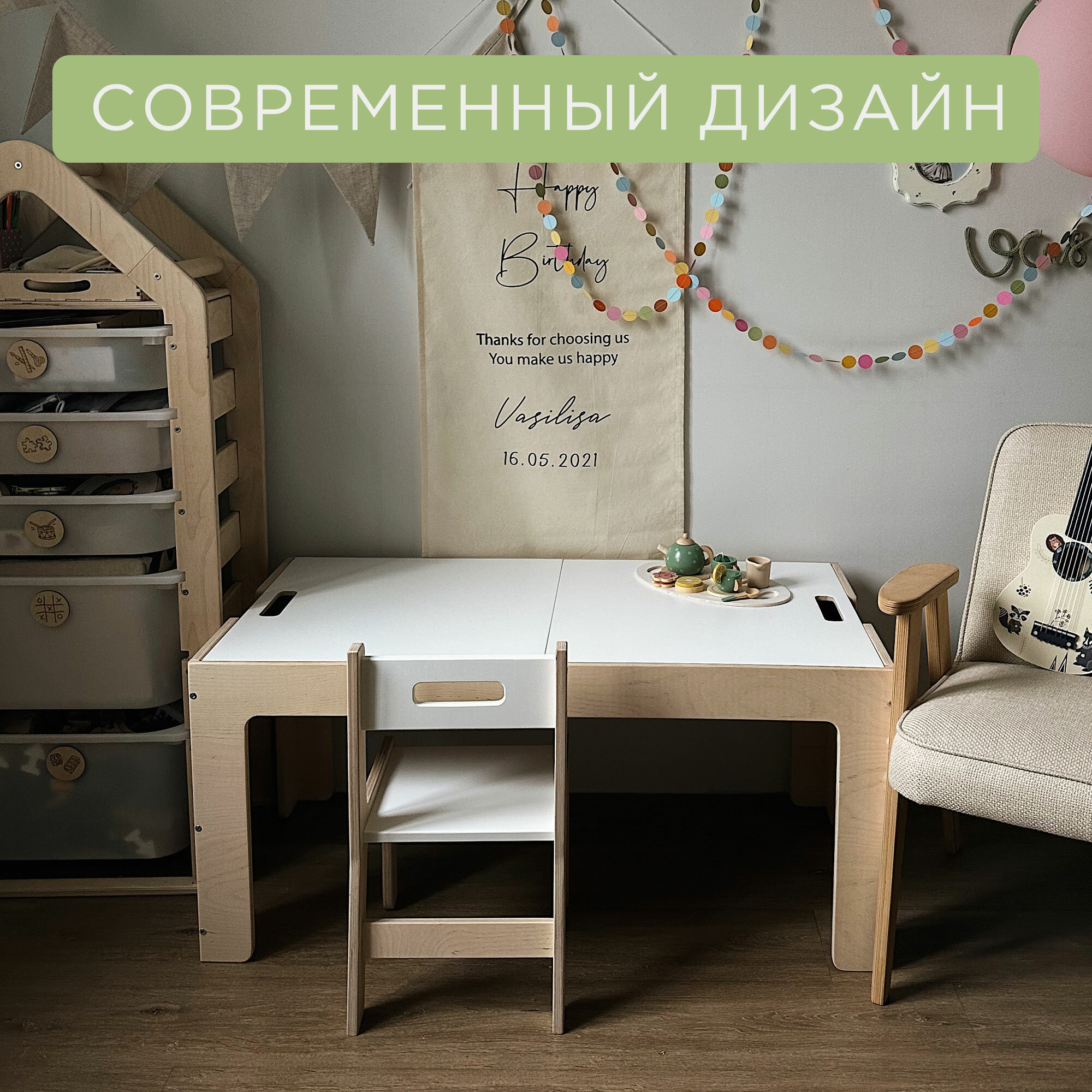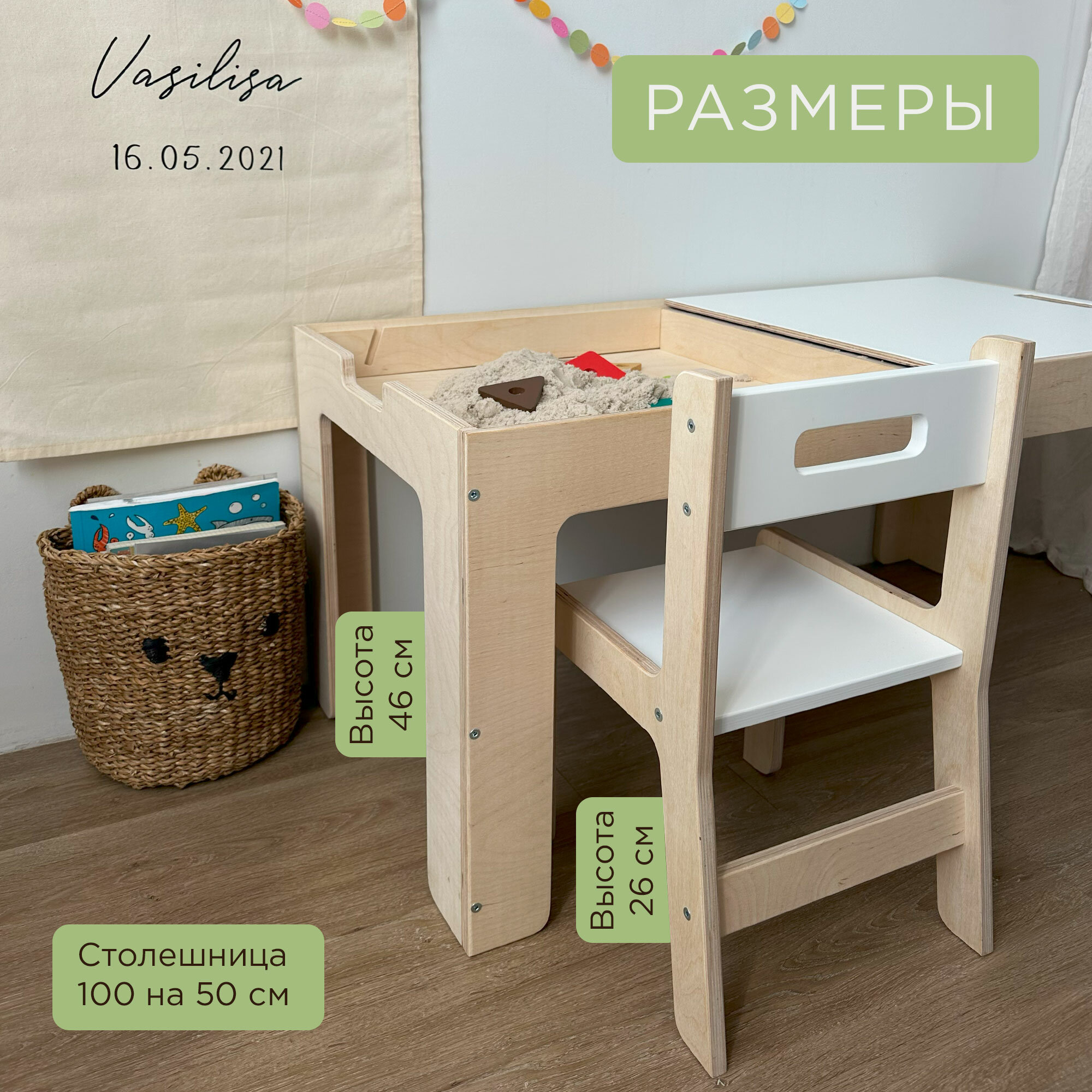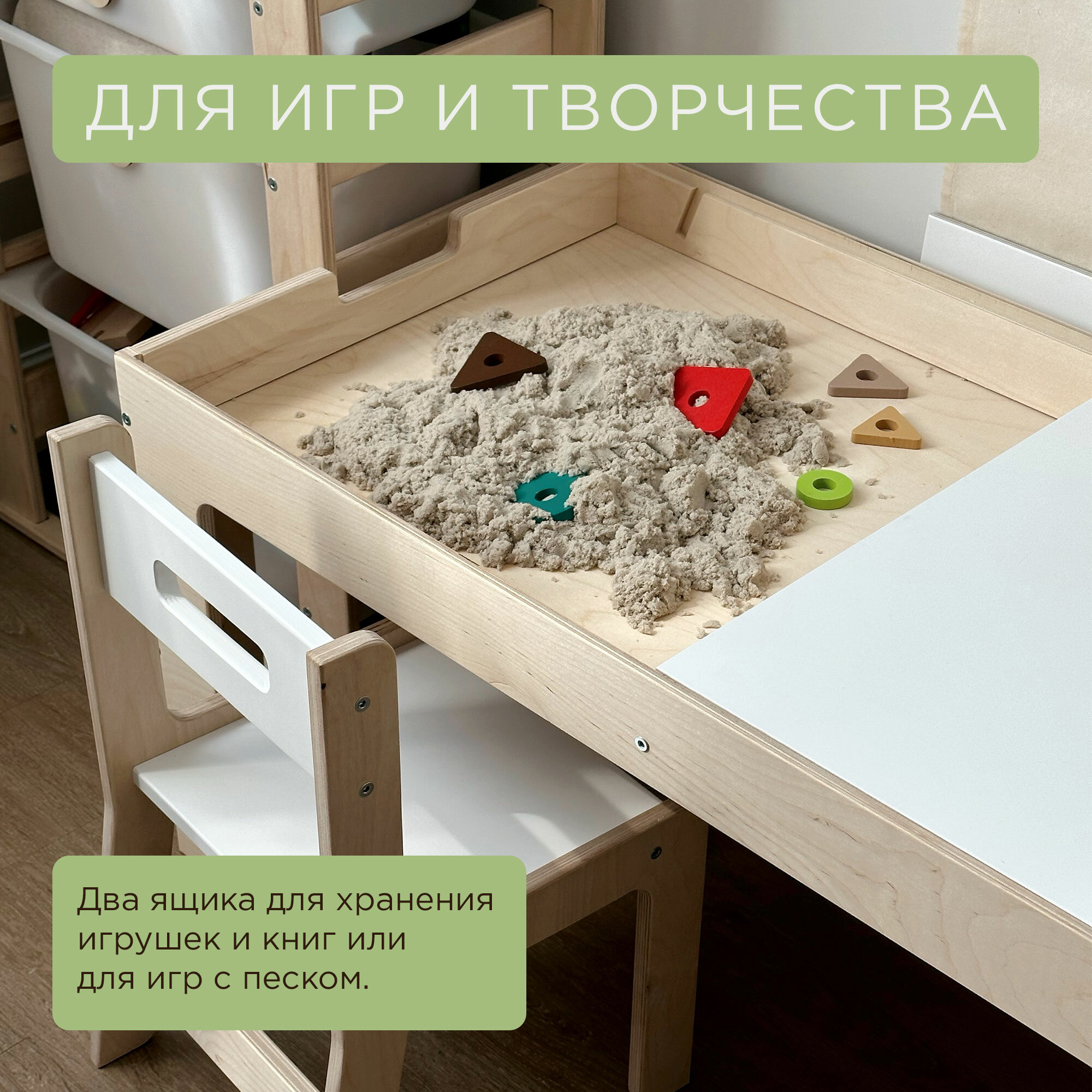 Вы ищете идеальную мебель для вашего малыша или малышей? Тогда вам точно стоит обратить внимание на наш комплект для творчества и игр - замечательное сочетание детского стола и стула. Наш детский стол и стул изготовлены из натурального дерева и отличаются стильным дизайном. Эта деревянная мебель предназначена для детей от года и обеспечит Вашему ребенку комфорт и удобство во время игр и занятий, а также поможет развить творческие навыки. Особенностью нашего комплекта является возможность трансформации - Вы сможете легко превратить стол в мольберт, в ящиках хранить кинетический песок, пластилин, карандаши, краски и другие принадлежности для развития и творчества ребенка. Уникальный дизайн нашей парты и стула стимулирует детское воображение и творческое мышление, создавая уютное пространство для изучения и игр. В комплекте идут 2 двусторонние доски с меловым покрытием, инструкция, фурнитура, 1стул (второй стул всегда можно докупить отдельно).