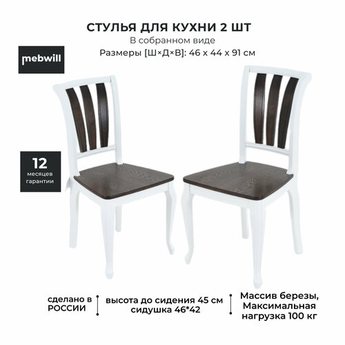 Цвет: эмаль белая/орех темный. Габариты (ШхГхВ) см – 45х44х91 Высота сиденья от пола — 44 см Максимальная нагрузка - 120 кг Комплект состоит из 2-х стульев. Вес одного стула - 4,9 кг Производство: Россия. Гарантия: 12 месяцев.