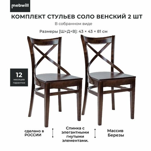 Комплект из 2-х деревянных стульев Соло венский Стулья изготовлены из массива березы. Стулья отличаются особой прочностью и долговечностью. У стульев ортопедическая спинка и мягкое сиденье
