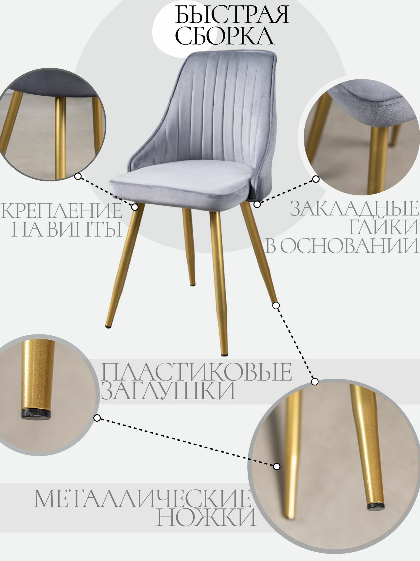 Стул поставляется в разборном виде: Каркас / ножки / крепеж для сборки (4 винта М6*20 под крестовую отвёртку).