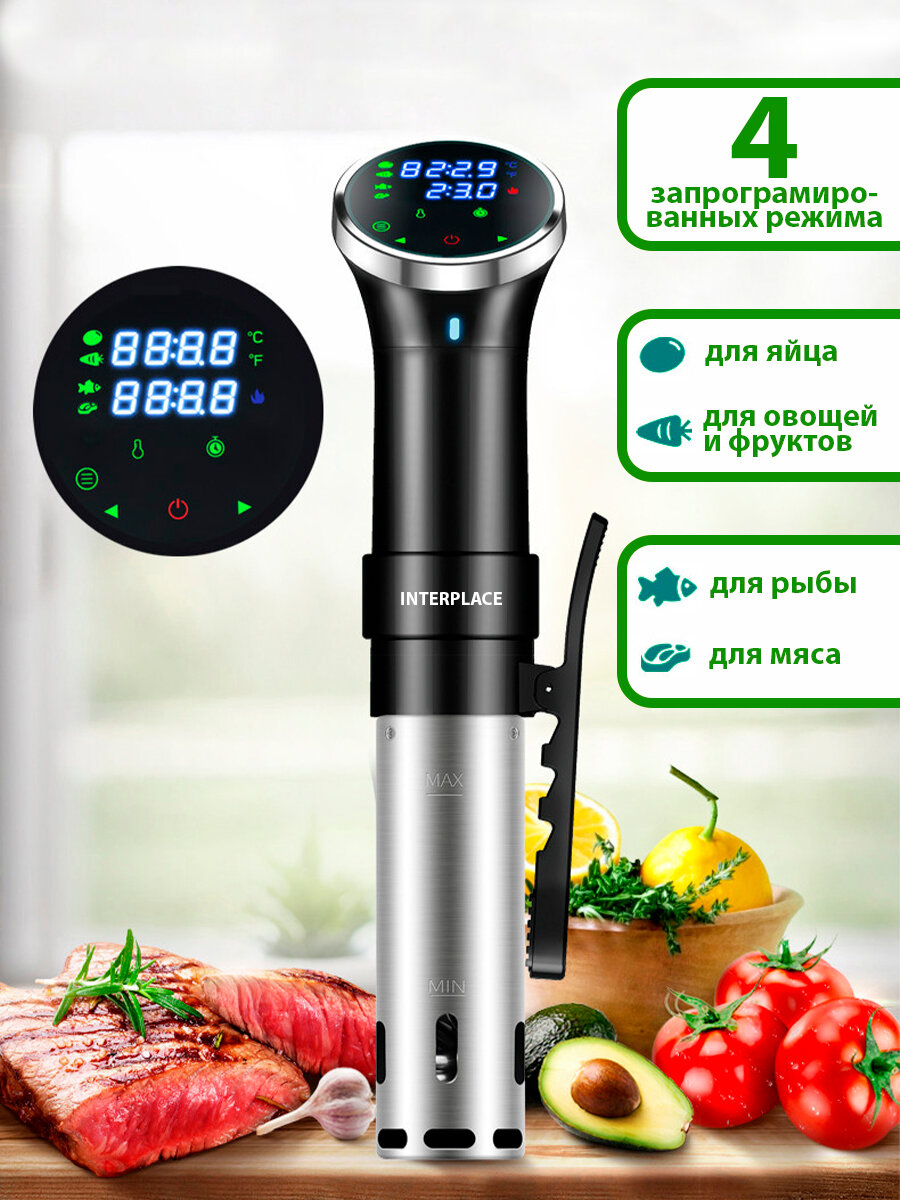 Комплект су-вид INTERPLACE - это набор, состоящий из су-вида, вакууматора, контейнера и разделителя. Этот набор предназначен для тех, кто ценит качество и удобство в приготовлении пищи.