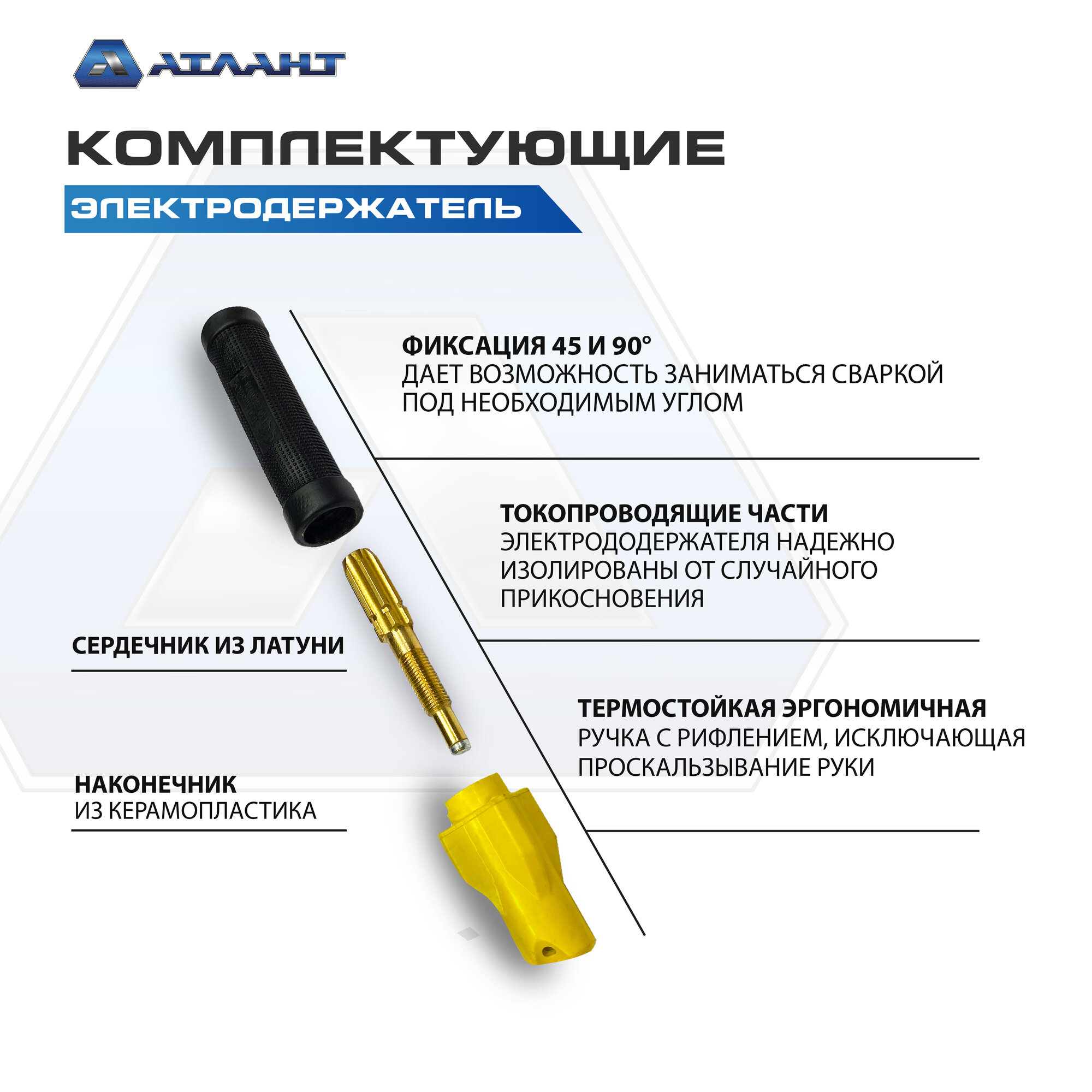 Один из главных компонентов набора – винтовой держатель электрода, обеспечивающий удобное управление электродом в процессе сварки. Ряд преимуществ: