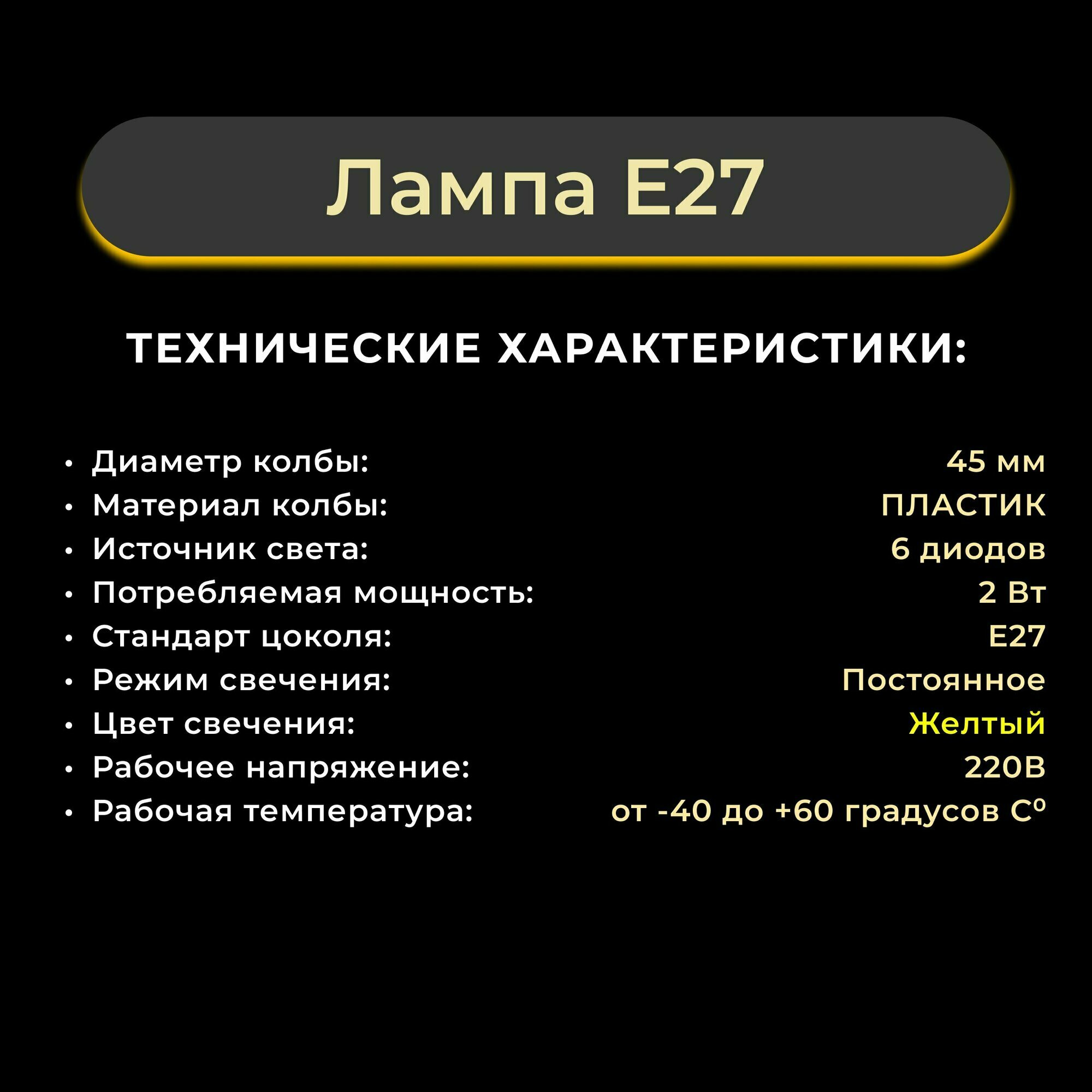 Комплект Светодиодных Ламп Е27 (G45) для Белт-Лайта, 25 шт, желтый свет, 2 Вт, пластик, 220 В. Код: 029805: сравнение цен, характеристики, фото, актуальное наличие и цены.
