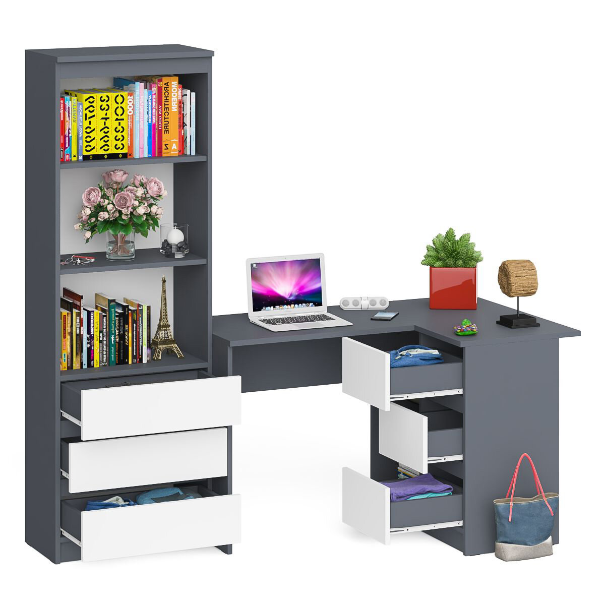 Стеллаж-комод три ящика Мори МСТ-600 с угловым компьютерным столом МС-16 тумба справа. Цвет - графит/белый. Габариты (ШхГхВ) 184,8х84,9х179,6 см. Выдвижные ящики справа. Не универсальная сборка. Отсутствие ручек главное преимущество данной модели. Угловой компьютерный стол МС-16 правый. Тумба имеет 3 выдвижных ящика и нишу с полкой по середине. Стеллаж МСТ600 с двумя полками сверху и тремя выдвижными ящиками снизу.