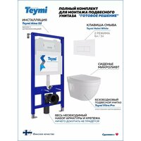Комплект «Готовое решение» для установки инсталляции с подвесным унитазом включает: -- инсталляция TEYMI AINA 52 T70011 – монтажная рама из стального профиля толщиной 1.5 мм увеличенной ширины 52,5 см с дополнительными вертикальными усиливающими стойками, что позволяет выдерживать нагрузки до 400 кг; -- цельнолитой бачок скрытого монтажа, обшитый кожухом из пенопласта; -- клавиша смыва TEYMI HELMI T70018WM, цвет белый матовый; -- унитаз подвесной TEYMI VITRA PRO T40806; -- быстросъёмное сиденье с микролифтом; -- полный комплект арматуры для монтажа, включающий в себя уплотнительные кольца и манжеты, трубу смыва, фановый отвод с удлинителем, защитный кожух ревизионного окна с крепежной рамкой, закрывающей панелью и крышкой; -- полный комплект крепежа для установки, а именно: крепеж к стене, шпильки для унитаза, крепежная рамка, соединительные шпильки, толкатели; -- инструкция по установке и обслуживанию. Преимущества комплекта «Готовое решение» для установки инсталляции с подвесным унитазом: -- полная (максимальная) комплектация для установки - больше ничего докупать не придётся; -- все составляющие комплекта идеально подходят друг к другу; -- взаимозаменяемость rкомплектующих; -- рама покрыта суперпрочной порошковой краской с антикоррозионными свойствами; -- высота рамы может регулироваться с ходом до 20 см с помощью ножек, изготовленных из оцинкованной стали; -- сливной бачок скрытого монтажа изготовлен из современных полимерных материалов и является цельнолитым (бесшовным), что позволяет ему работать без протечек в течение всего периода эксплуатации; -- специальный кожух из пенопласта защищает сливной бачок от возникновения конденсата и создаёт дополнительную шумоизоляцию; -- лёгкость обслуживания сливного бачка достигается благодаря удобному ревизионному окну, скрытому за клавишей смыва; -- клавиша смыва имеет две кнопки и работает в режиме эконом / полный (объёмы смыва 3 / 6 литров); -- гарантия на весь комплект составляет 10 лет, а рама прослужит все 50. Комплект «Готовое решение» для установки инсталляции TEYMI AINA 52 с подвесным унитазом TEYMI VITRA PRO T40806 и клавишей TEYMI HELMI T70018WM в цвете белый матовый подобран специально для того, чтобы покупателям было проще сориентироваться в огромном выборе товаров для ванной комнаты. Оптимальное сочетание инсталляционной системы, клавиши смыва и подвесного унитаза позволит не задумываясь сделать правильный выбор. Инсталляция для подвесного унитаза от известного финского бренда TEYMI предназначена для оборудования санузлов и выгодно отличается своей надёжностью и простотой установки. Уважаемые покупатели, обращаем ваше внимание на то, что система инсталляции TEYMI AINA 52 может быть также укомплектована другими клавишами смыва или подвесными унитазами от бренда TEYMI (вы легко сможете найти их на этом сайте по указанным артикулам). Предлагаем вам рассмотреть варианты сочетания со следующими клавишами: : HELMI хром T70202CH : HELMI черная T70203BM : HELMI белая T70018WM : LINA хром T70102CH : LINA черная T70103BM : LINA белая T70019WM : AINA хром T70012CH : AINA черная T70013BM : AINA белая T70020WM : KATI хром T70701CH : KATI черная T70702BM : KATI белая T70021WM : ELLIE хром T70022CH : ELLIE черная T70023BM : ELLIE белая T70024WM Также просим обратить взгляд на наши лучшие безободковые подвесные унитазы: : SOLLI T40201 : LINA S T40102 : HELMI S T40302 : HELMI VORTEX T40303 : IVA T40601 : ELLIE T40802 : LINA MEDIA T40105 : LORI T40501 : KATI T40701 : HANNA PRO T40901 : HELMI S BLACK T40302MB : VITRA PRO T40806 : VITRA T40804 : DEMI T40208 : LINA VORTEX T4011