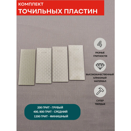 Даже самый лучший нож из дорогой стали рано или поздно потребует правки или заточки! Предлагаем вашему вниманию набор из 4 металлических пластин с высококачественным алмазным покрытием. Алмаз является самым популярным абразивом, применяемым в заточке. В отличие от обычных брусков алмазные пластины износостойки, не требуют ухода. Со временем не потеряют своей формы. Работать с брусками можно без смачивания - «на сухую».