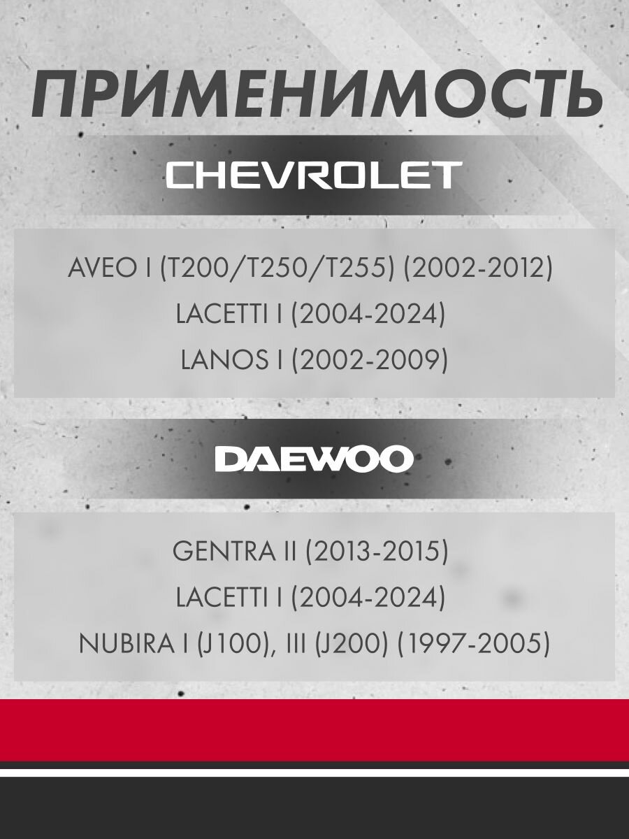 Chery Tiggo, Chery Tiggo 2, Chery Tiggo 4, Chevrolet Lacetti, Daewoo Gentra, Daewoo Lacetti, Daewoo Lanos, Great Wall Hover, Great Wall Hover H3, Great Wall Hover H5, Great Wall Safe, Haval Dargo, Haval F7, Haval F7X, Haval Jolion, Hyundai Creta, Hyundai Elantra, Hyundai Grandeur, Hyundai Santa Fe, Hyundai Solaris, Hyundai Sonata, Hyundai Tucson, Hyundai i20, Hyundai i30, Hyundai i40, Hyundai ix35, Kia Ceed, Kia K5, Kia Optima, Kia Rio, Kia Rio X-Line, Kia Sorento, Kia Sportage, SsangYong Actyon, SsangYong Actyon Sports, SsangYong Korando, SsangYong Kyron, SsangYong Musso, SsangYong Rexton, Tank 500, ТагАЗ Tager