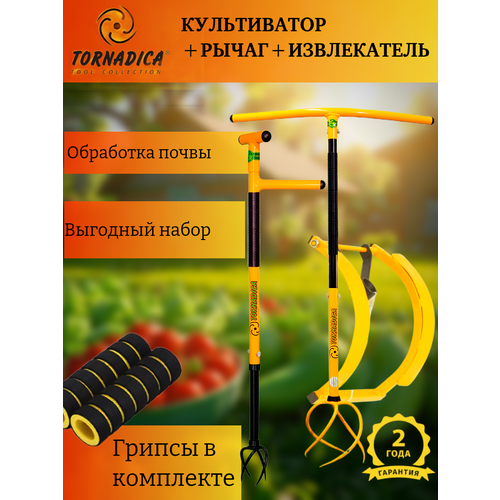 Комплект Торнадика (Tornadica) садовый культиватор с грипсами, рычаг-педаль, извлекатель сорняков. Комплект предназначен для быстрого рыхления почвы любой плотности, извлечение больших и малых сорняков, быстрой прополки, рыхления междурядий и т. д, а ручки-грипсы надежно защитят Ваши руки. Приобретая садовые инструменты Торнадика в комплекте, вы экономите своё время и получаете выгодную цену.