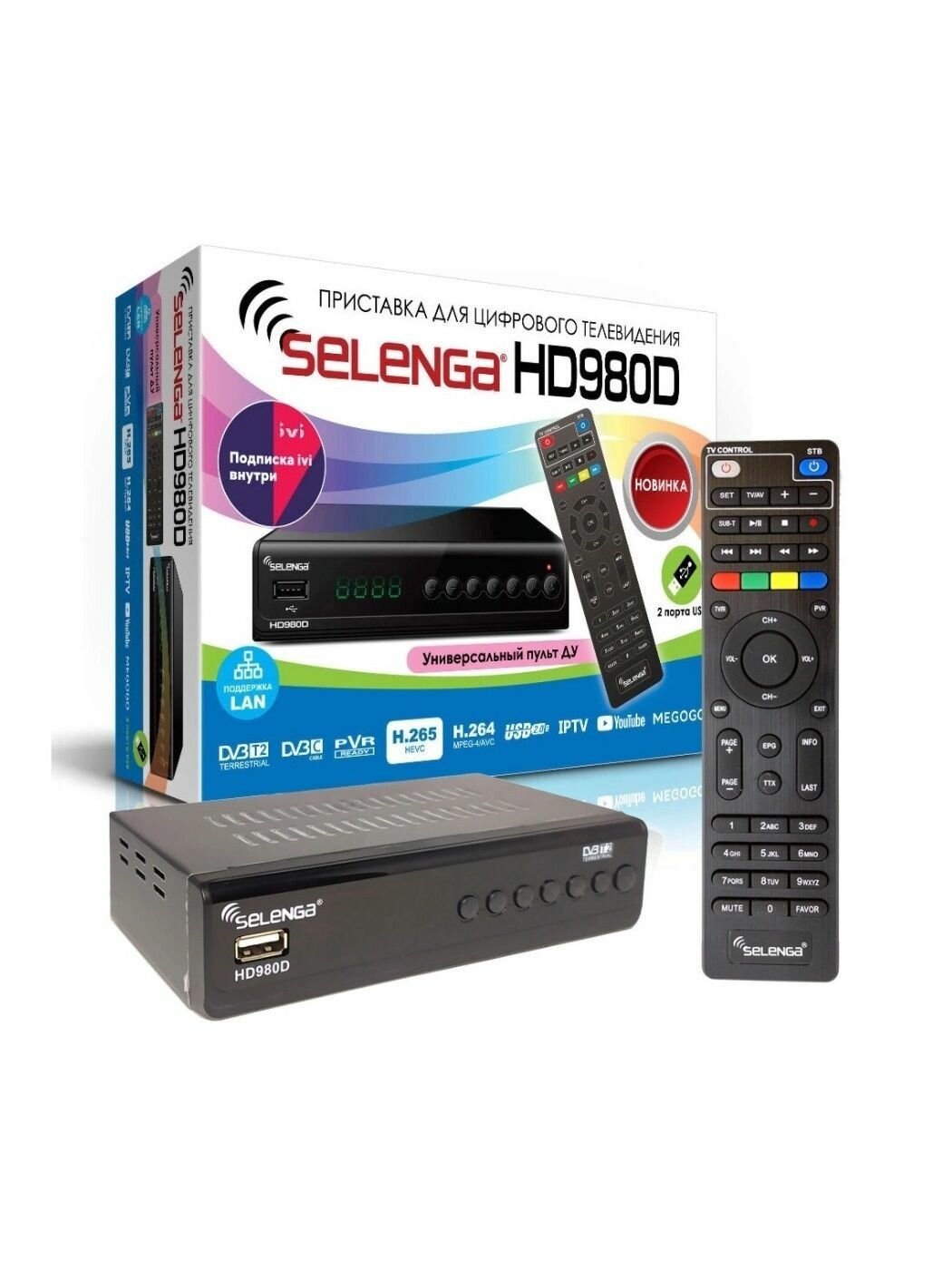 SELENGA HD980D (H.265, LAN) флагманская премиум модель предназначенная для приема открытых телеканалов в стандарте DVB-T2 на базе процессора GX6702H5 со встроенным LAN портом, а также встроенным блоком питания 220В и поддержкой внешнего блока питания 5В и 12В! Корпус приставки выполнен из металла. Приставка оснащена помехоустойчивым высокочувствительным тюнером MaxLinear 608. Центральный процессор – GX6702H5, обеспечивающий работу сразу с двумя портами USB 2.0 и сетевым LAN - портом 100 Мбит. Сверху, снизу, с боков корпуса находятся вентиляционные отверстия для охлаждения аппаратных модулей. Дисплей – стандартный 4-х разрядный индикатор. Аналогично модели T68D яркость дисплея регулируется в меню приставки, отображается на выбор пользователя либо Часы, либо Номер Канала.