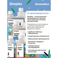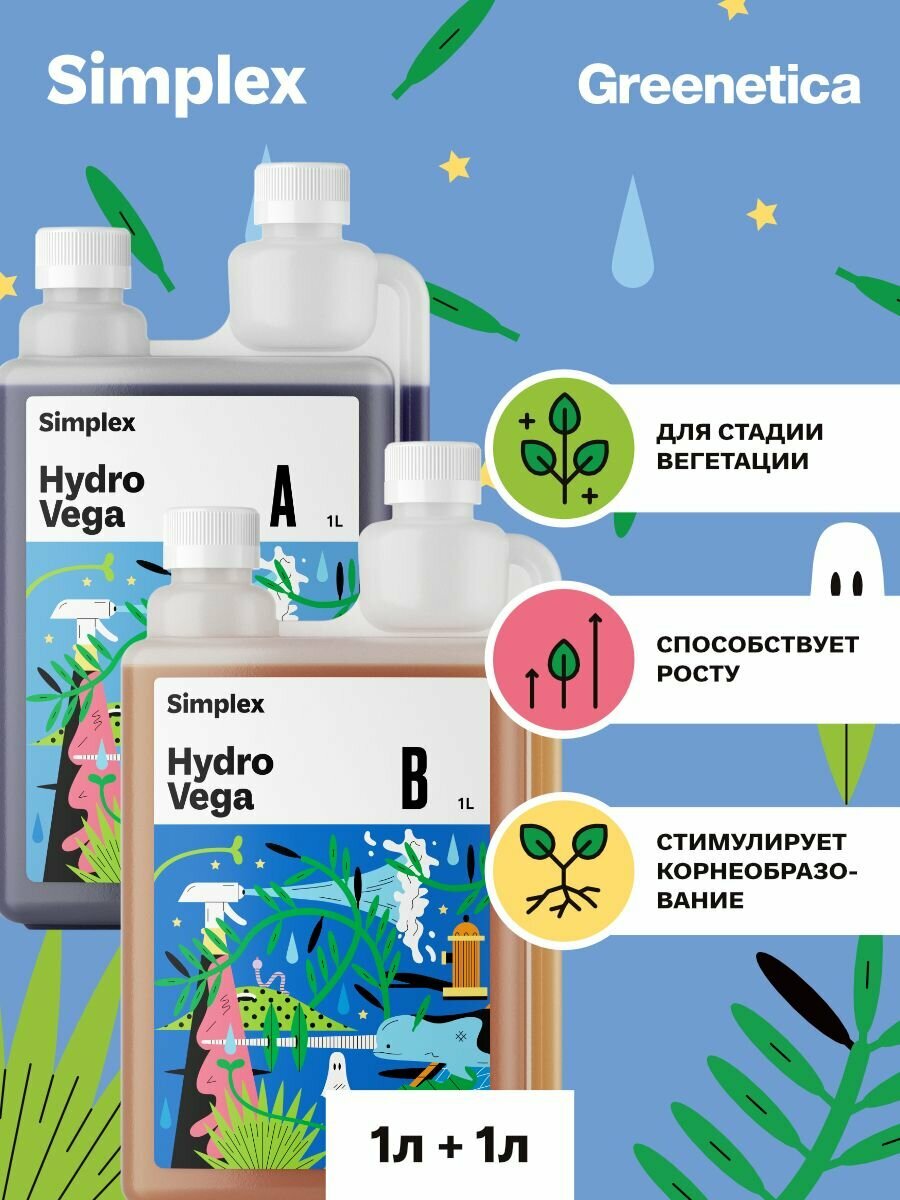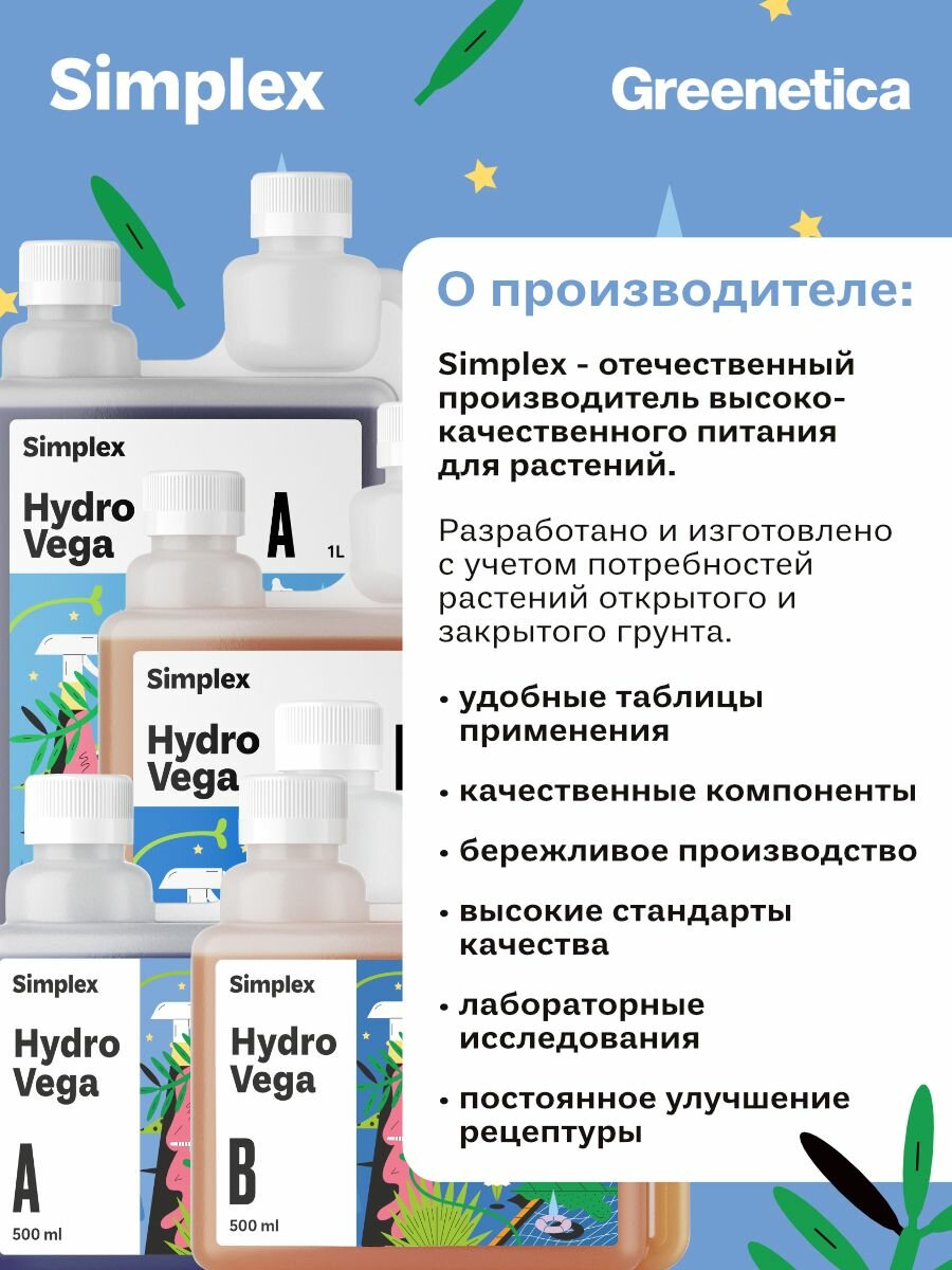 Способствует росту растения со второй недели жизни до стадии предцвета Сбалансированный состав удовлетворяет все потребности растения Помогает правильному развитию надземной части и корневой системы растения Стимулирует развитие правильной микрофлоры в прикорневой зоне, создает условия образования микоризы Обеспечивает стабильный уровень рН Подходит для гидропонных систем любого типа Легко дозируется благодаря удобной бутылке с дозатором Одного комплекта Simplex Hydro Vega (А & В) достаточно для полноценного развития растения вплоть до стадии цветения