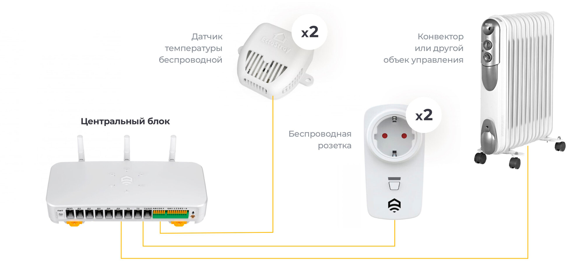 Центральный блок ectoControl v4.0, Датчик температуры воздуха беспроводной 2 шт., Беспроводная розетка 220В 2 шт., Все необходимое для подключения и инструкция