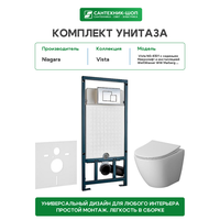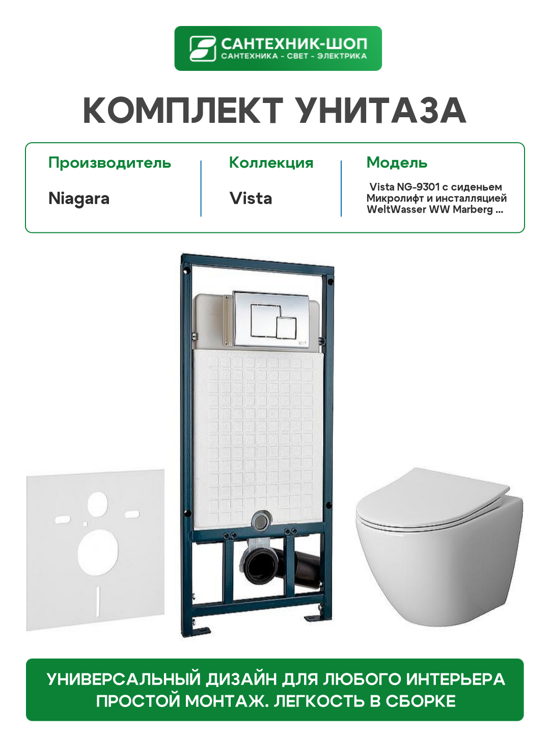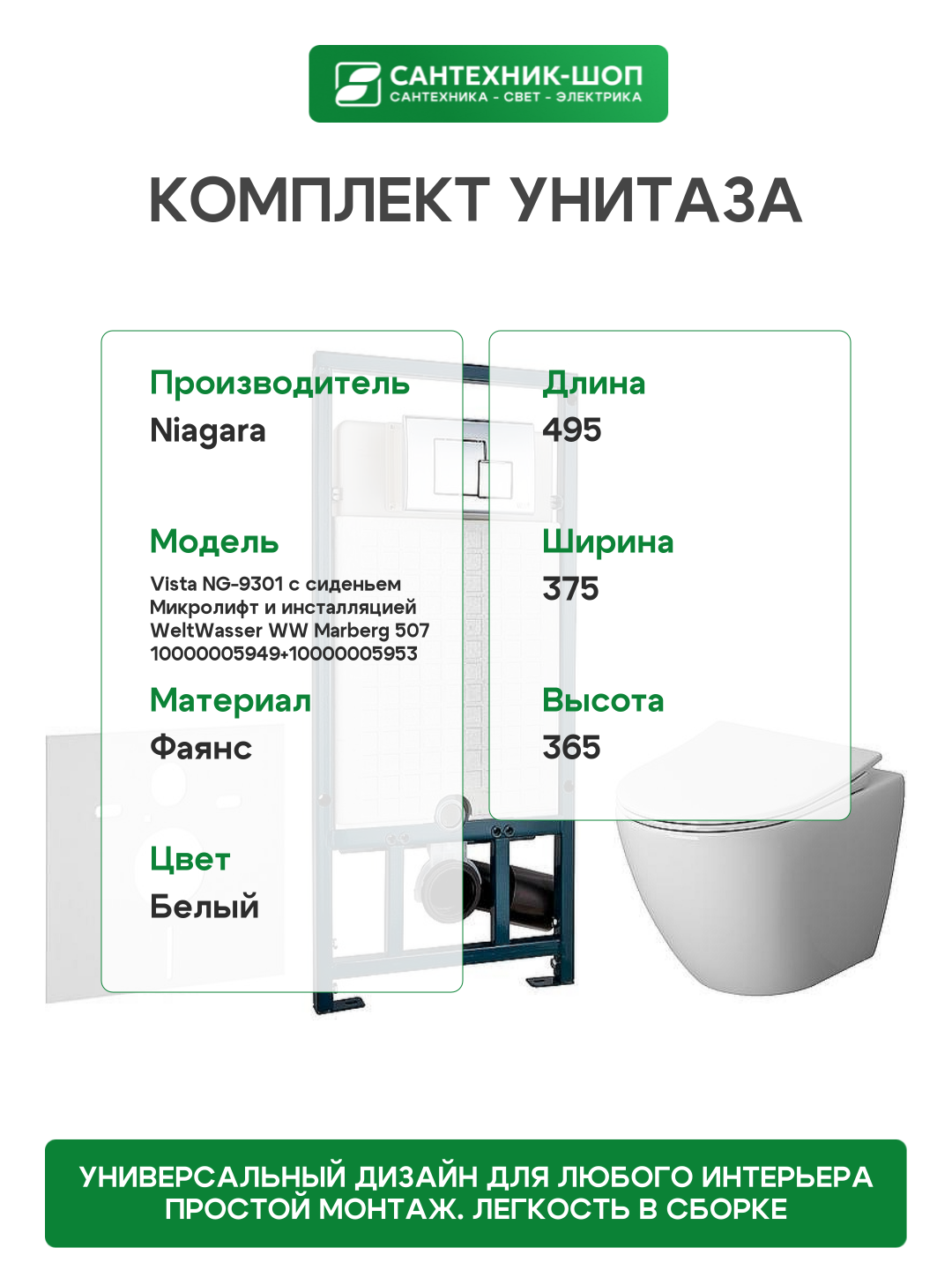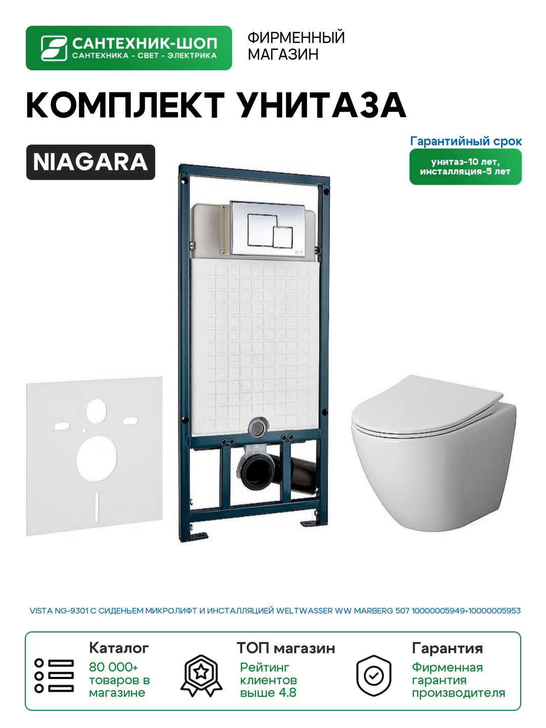 Комплект унитаза Niagara Vista NG-9301 с сиденьем Микролифт и инсталляцией WeltWasser WW Marberg 507 10000005949+10000005953 с клавишей смыва Хром глянцевый