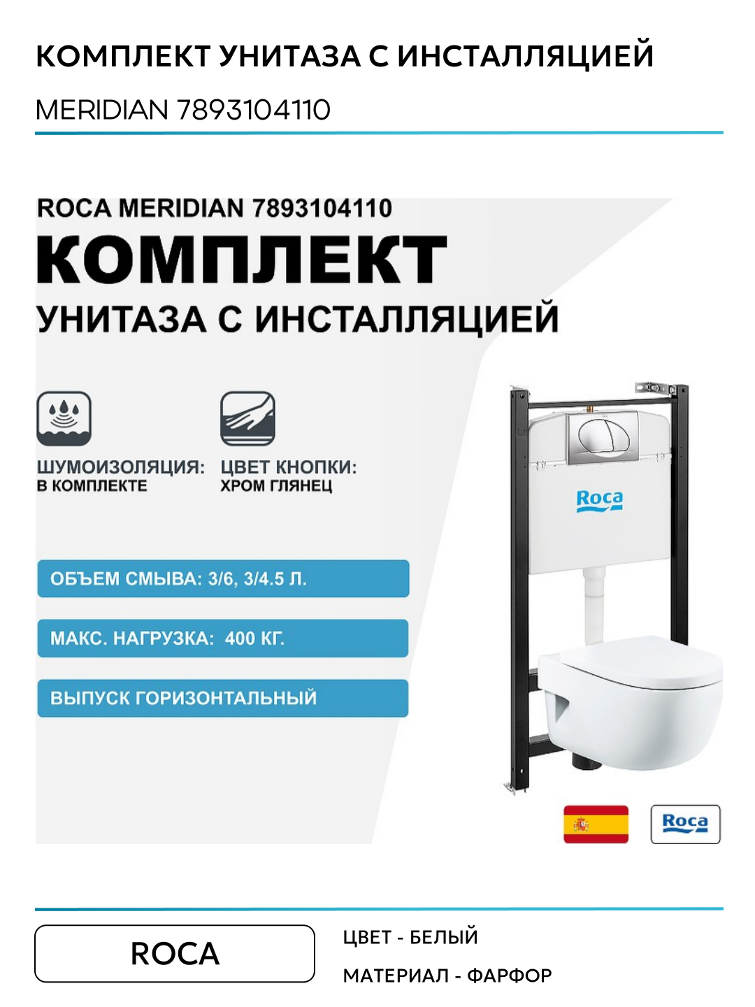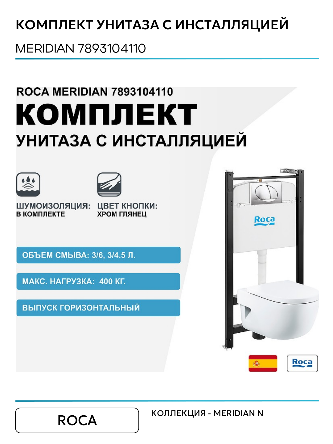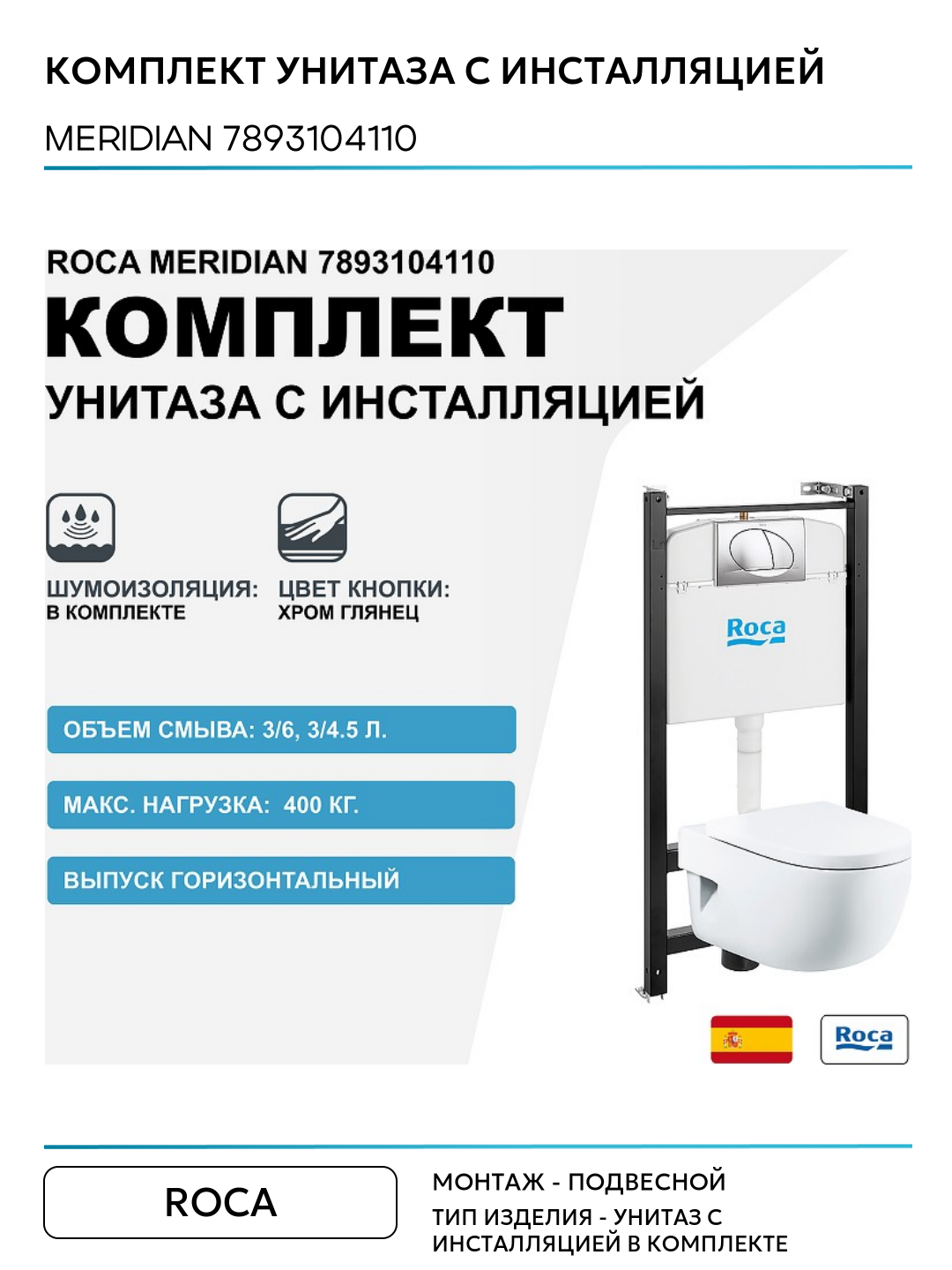 Комплект унитаза с инсталляцией Roca Meridian 7893104110 с сиденьем Микролифт и клавишей смыва: сравнение цен, характеристики, фото, актуальное наличие и цены.
