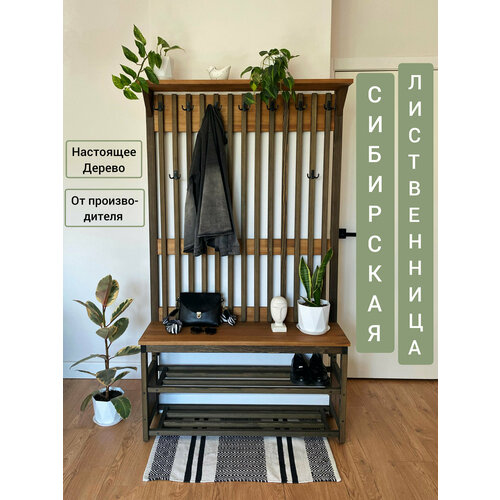 Комплект в прихожую, деревянная вешалка с обувницей, прихожая из массива Сибирской Лиственницы 185х105х32, цвет черный, Орех: сравнение цен, характеристики, фото, актуальное наличие и цены.