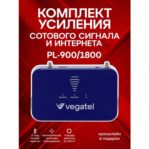 | Комплектация | Репитер VEGATEL PL-900/1800; Антенна уличная с кабелем 3D/FB (SMA – male) 10 метров; блок питания 5В/2А; инструкция по эксплуатации; Г-образный кронштейн 15 см |