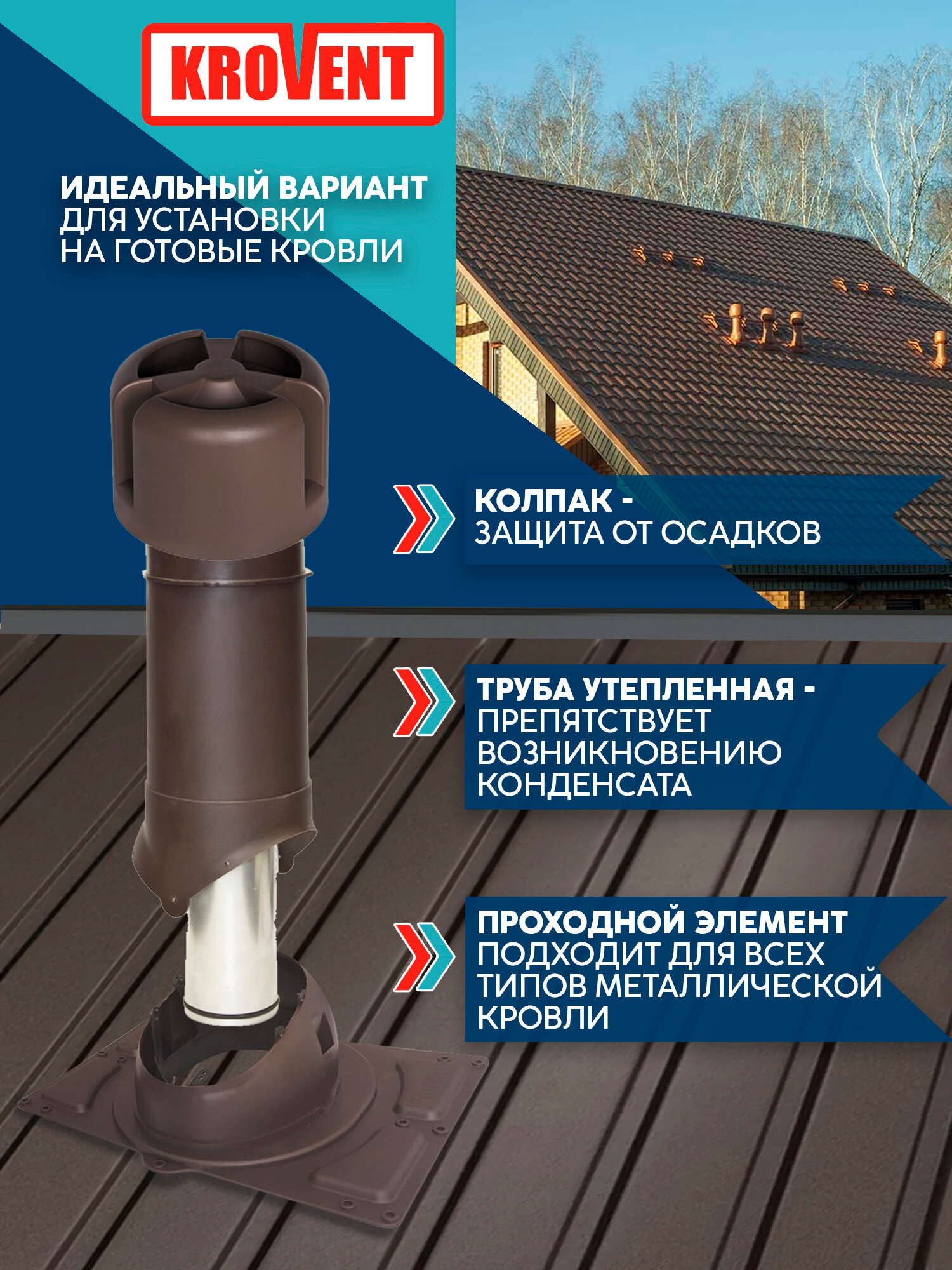Купить Комплект вентиляции для всех видов металлической кровли 125/500 Krovent, коричневый с доставкой по всей России.