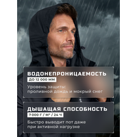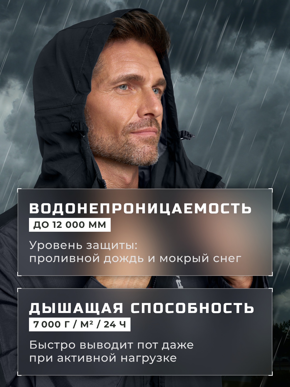 Куртка Комбинированная подкладка с сеткой. Регулируемый по объёму в 2х плоскостях капюшон. Застежка на молнию закрыта ветровлагозащитной планкой. Центральная двухзамковая тракторная молния, отличающаяся легкостью хода, устойчива к попаданию грязи и влаги. Два вместительных внешних и один внутренний карман. Светоотражающие элементы для обеспечения безопасности в темное время суток. Регулируемые манжеты на рукавах. Внутренние манжеты с защитой от затекания воды в рукава. Низ куртки оснащен кулиской для подгонки по фигуре. Брюки Два вместительных кармана. Артикулированные 3D колени и эргономичная конструкция штанин, не ограничивающие подвижность. Регулируемые манжеты на брюках. Все швы и молнии проклеены, что помогает избежать проникновения влаги внутрь костюма. Световозвращающие элементы, обеспечивающие безопасность в темное время суток. Дышащая способность ткани: 7 000 г/м²/24ч (для активного отдыха). Высокая водонепроницаемость: 12 000 мм (дождь/ мокрый снег).