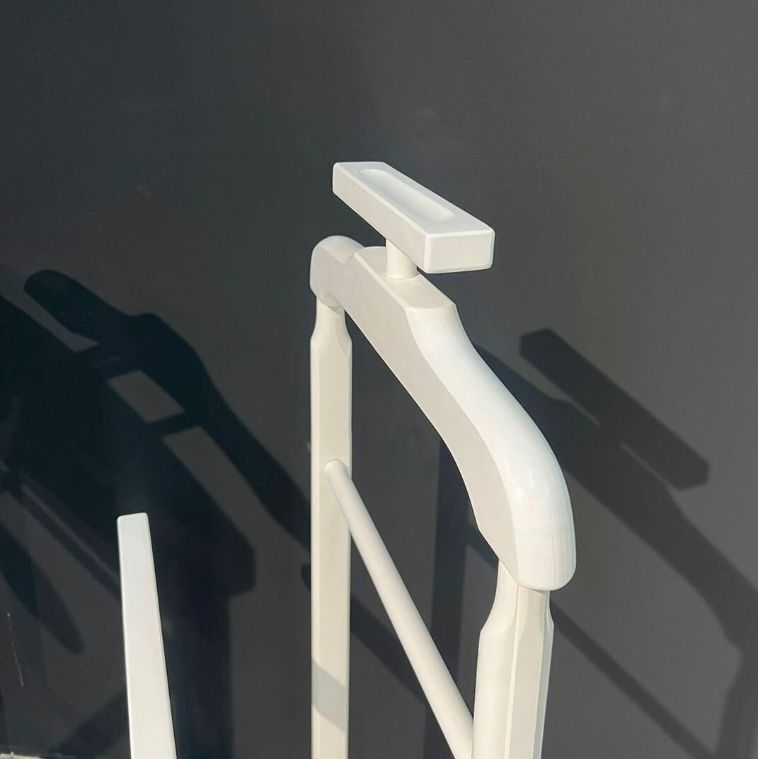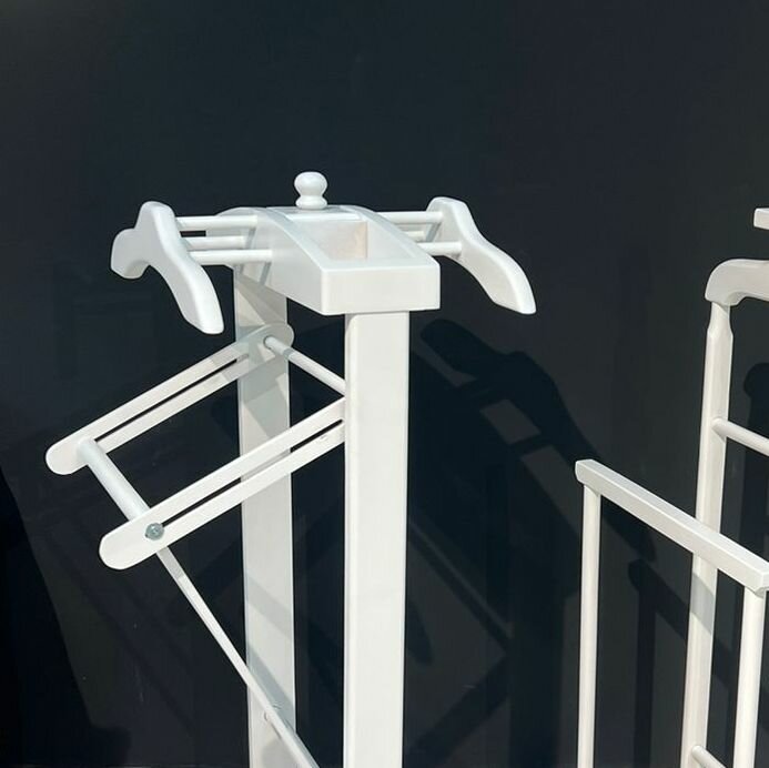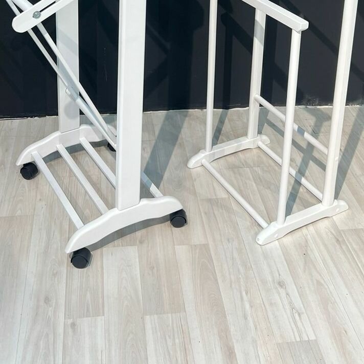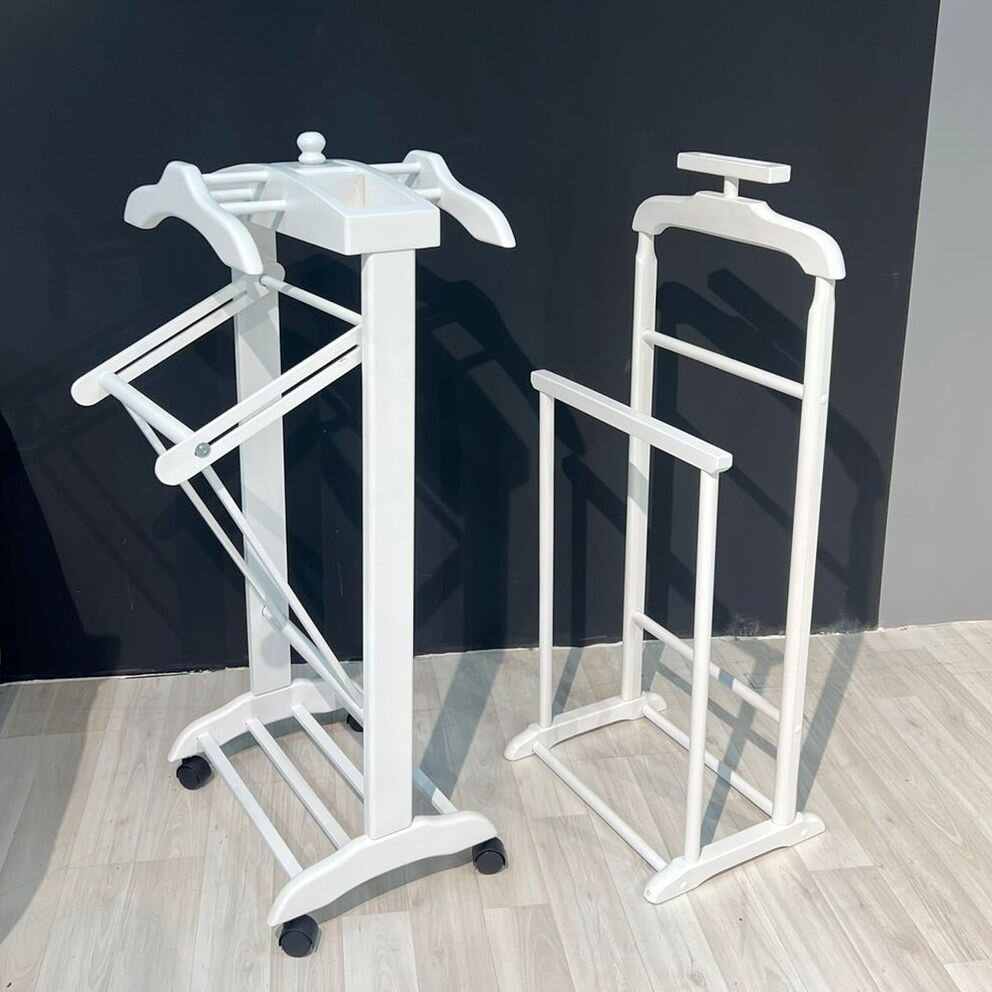 Комплект вешалок в белом цвете выполнен из массива дерева. Вешалка №1 выполнена из массива бука, имеет несколько уровней для хранения, выдвигающуюся перекладину для брюк, колесики, ящик для мелочей. Габариты 105 см х 45 см х 38 см. Вешалка №3 выполнена из массива березы, имеет два уровня, плечики и дополнительные перекладины. Габариты 100 см х 21 см х 42 см.