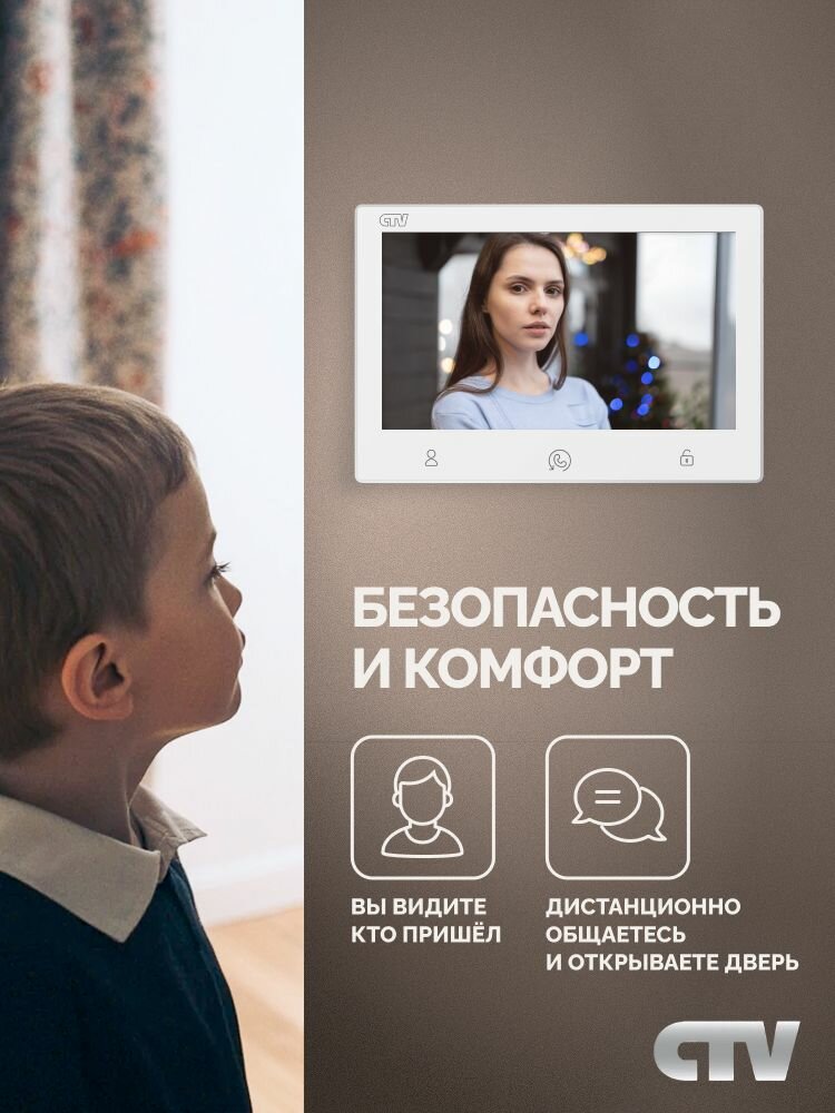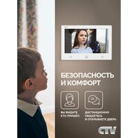 | Комплектация | Коробка 1: Монитор CTV-M3713 Astra 2: Монтажная пластина для крепления монитора на стене 3: Вызывная панель CTV-D40 Plus 4: Монтажный уголок 5: Защитный козырек 6: Коннекторы для подключения вызывных панелей, камер, дополнительных мониторов, модуля сопряжения подъездного домофона, дополнительного источника питания 7: Клеммный зажим для подключения к электросети 8: Крепежный комплект 9: Краткие инструкции к монитору и панели |