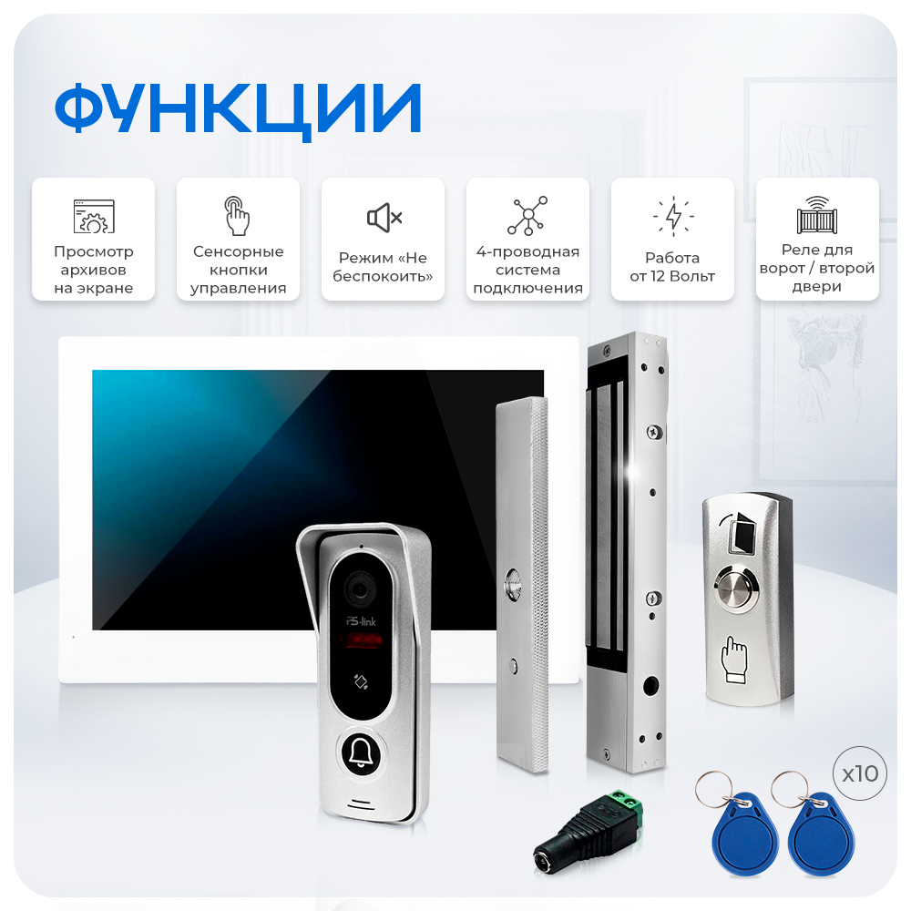 Настройка и управление домофона осуществляются с помощью сенсорного управления и графического меню на экране. Монитор также предлагает возможность удаленной коммуникации с гостями через приложение и WIFI подключение к интернет сети. В комплект поставки входит магнитный замок двери с силой удержания 280 килограмм, что упрощает процесс допуска на объект владельца и гостей. Для удобства набор доступа содержит 10 компактных ключей, число которых легко увеличивается простыми действиями. Комплект обладает функцией записи на карту памяти позволяет просматривать фотографии и видеофайлы, сохраненные на видеодомофоне с установленной картой памяти, обеспечивая удобный доступ к записям и изображениям с устройства для мониторинга и без необходимости подключения к внешним источникам данных. Кроме того, программная детекция движения работает на одном из каналов - вызывных панелей или камер.