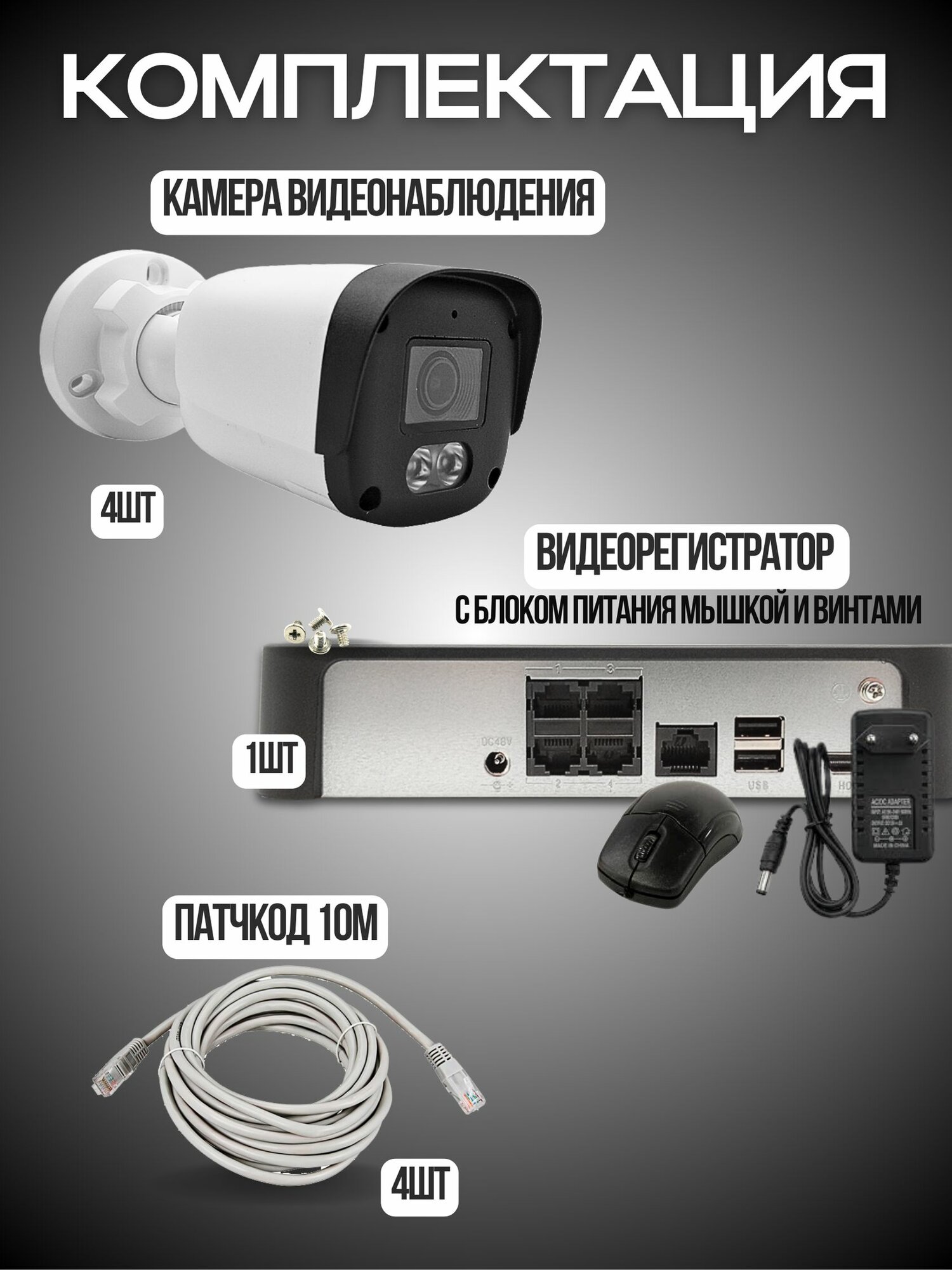 | Подробная комплектация | Видеорегистратор 4 канальный – 1 шт, Камера видеонаблюдения уличная 2МП – 4 шт, Коммутатор POE – 1 шт, Блок питания 2А для видеорегистратора – 1 шт, Кабель UTP 10м – 4 шт, USB-мышь для управления видеорегистратором – 1 шт, Комплект для крепежа камер – 4 шт, Комплект крепежей для установки жесткого диска – 1 шт, Паспорт на камеру – 4 шт, Паспорт на видеорегистратор – 1 шт, Краткая инструкция по подключению – 1 шт. |