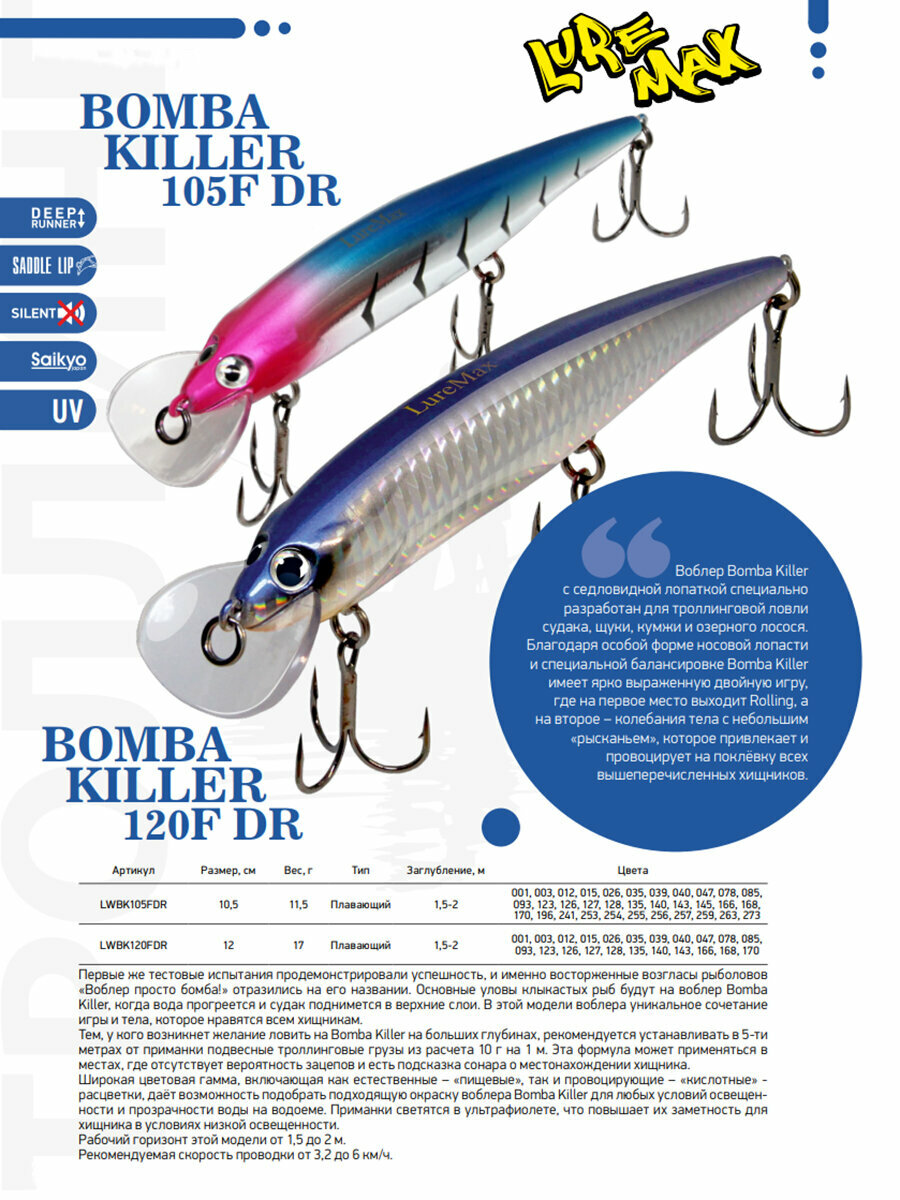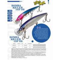 Воблер Bomba Killer с седловидной лопаткой специально разработан для троллинговой ловли судака, кумжи и озерного лосося. Благодаря особой форме носовой лопасти и специальной балансировке Bomba Killer имеет ярко выраженную двойную игру, где на первое место выходит Rolling, а на второе – колебания тела с небольшим «рысканьем», которое привлекает и провоцирует на поклёвку всех вышеперечисленных хищников.