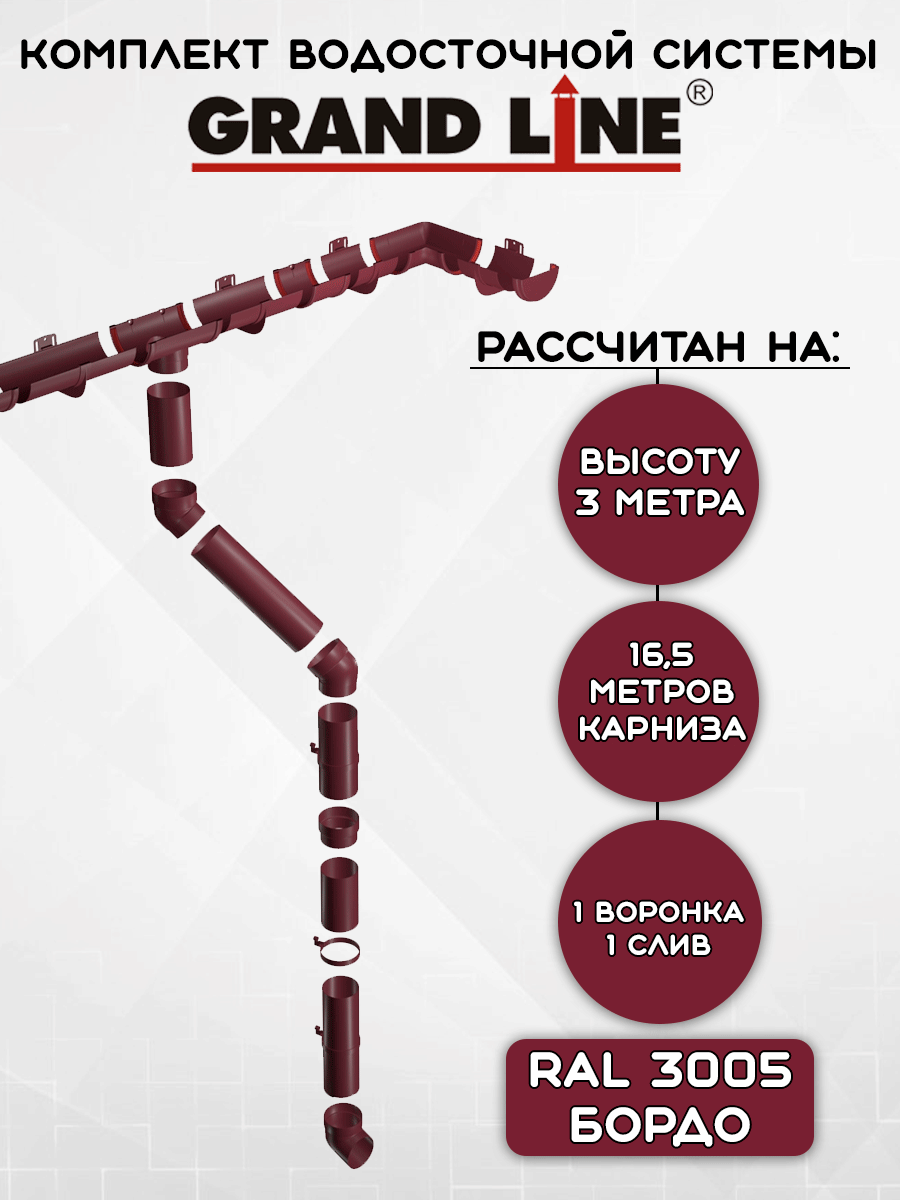 Комплект водосточной системы Grand Line бордовый 16,5 метров (1 слив) (120мм/90мм) водосток для крыши пластиковый Гранд Лайн вишневый (RAL 3005): сравнение цен, характеристики, фото, актуальное наличие и цены.