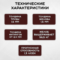 | Тип элемента | воронка, желоб, заглушка желоба, колено, колено сливное, крепление для желоба, муфта, переходник, соединитель желобов, труба водосточная, угол желоба, хомут трубы |
