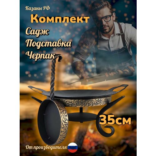 Комплект Воронёный /садж с вырезными ручками35см+подставка+черпак с коваными ручками/Казаны РФ: сравнение цен, характеристики, фото, актуальное наличие и цены.