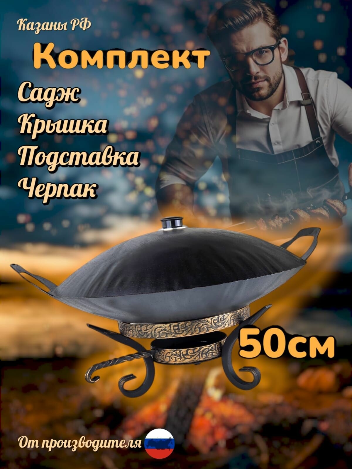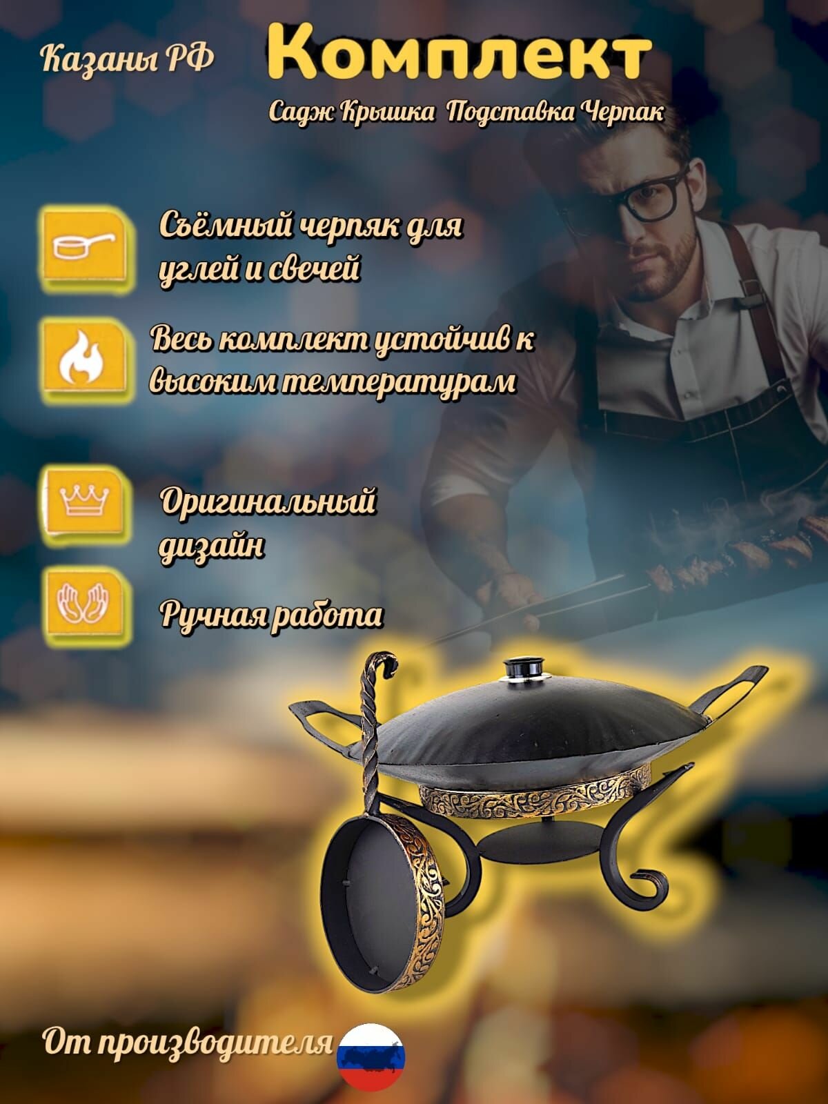 Комплект Воронёный /садж с вырезными ручками50см+крышка+подставка+черпак с коваными ручками/Казаны РФ: сравнение цен, характеристики, фото, актуальное наличие и цены.