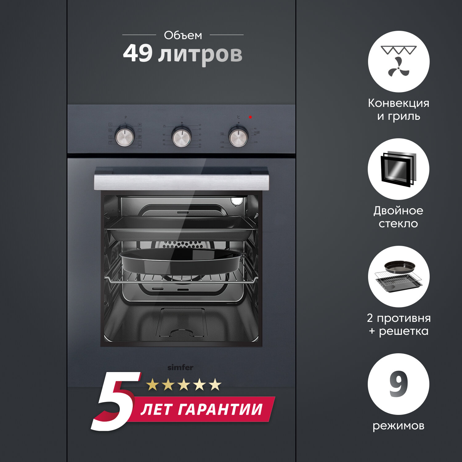 | Комплектация | стандартный противень с антипригарным покрытием; хромированная решётка; круглый противень; инструкция по эксплуатации; гарантийный талон |