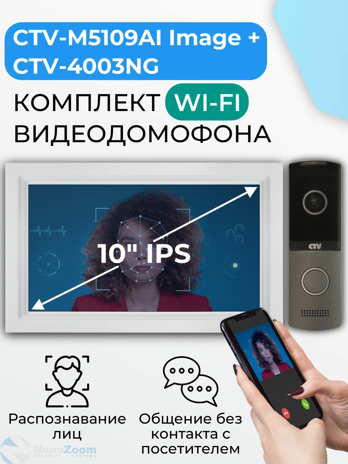 Купить Комплект WiFi видеодомофон для квартиры: монитор 10″ CTV-M5109AI Image (W) + вызывная панель CTV-D4003NG (G), для дома, офиса, управление со смартфона, AI-функции, подключение к подъездному домофону с доставкой по всей России.