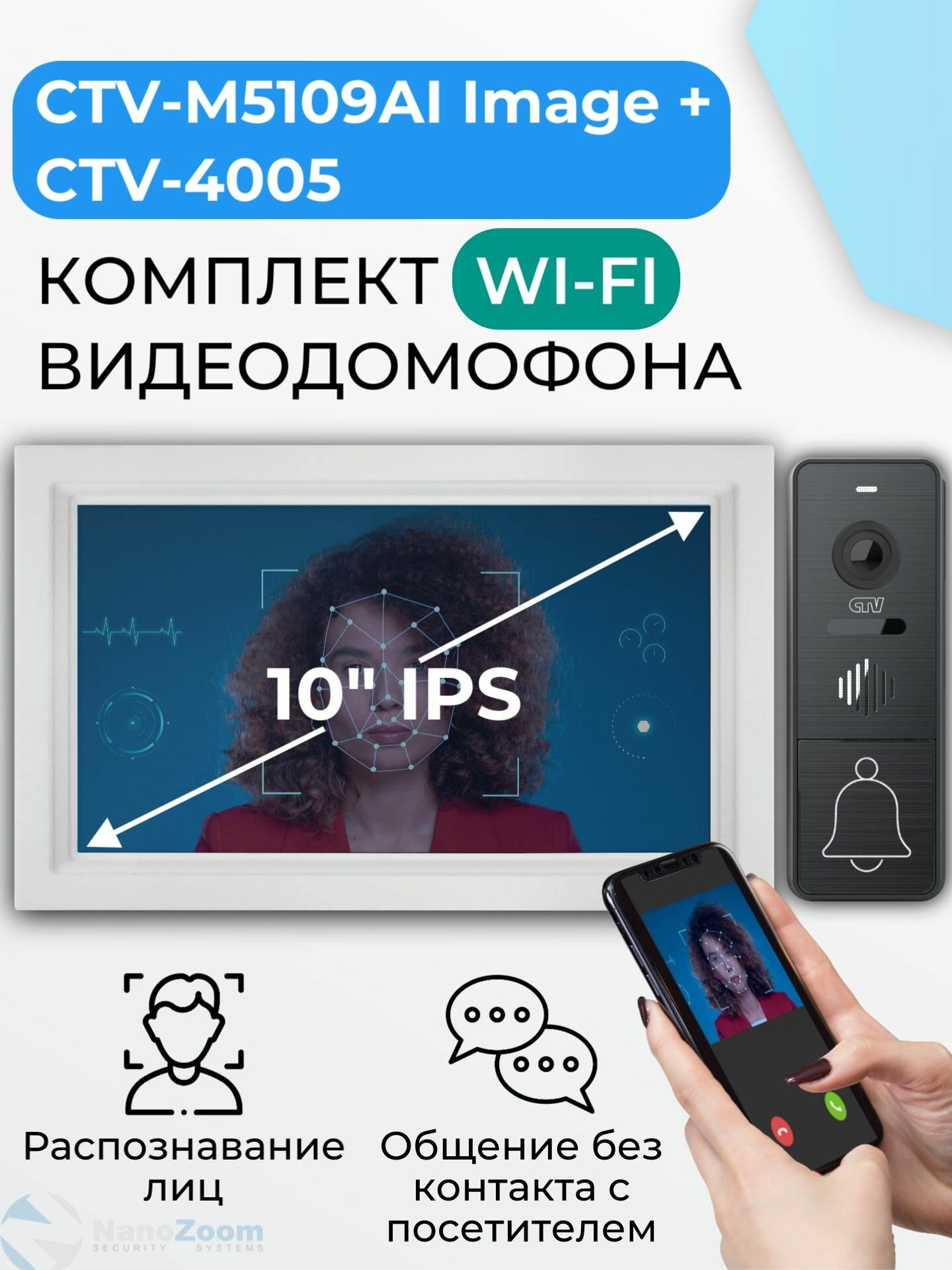 Купить Комплект WiFi видеодомофон для квартиры: монитор 10″ CTV-M5109AI Image (W) + вызывная панель CTV-D4005 (G), для дома или офиса, управление со смартфона, AI-функции, подключение к подъездному домофону с доставкой по всей России.