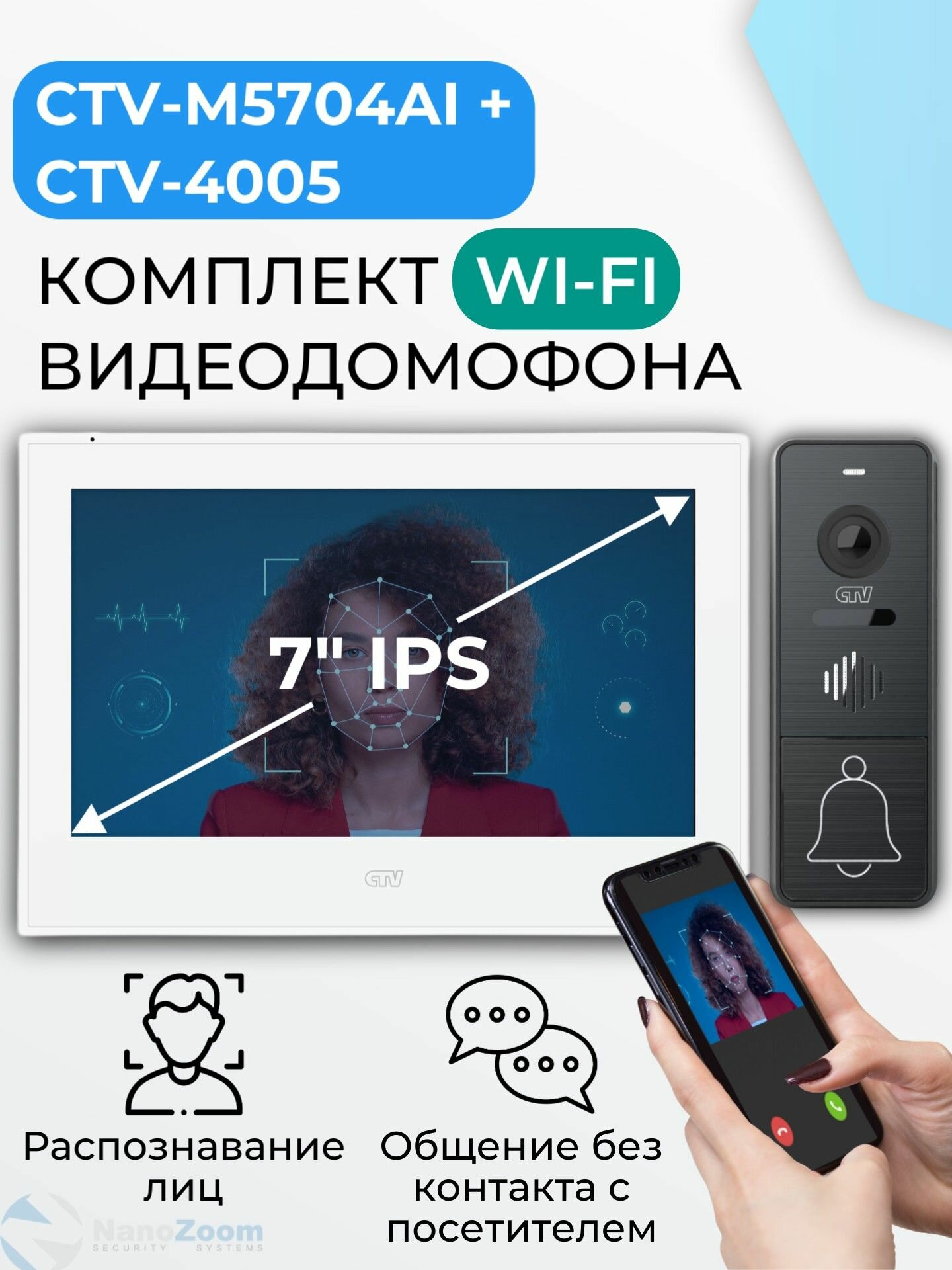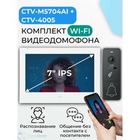 Комплект WiFi видеодомофон для квартиры: монитор 7" CTV-M5704AI (W) + вызывная панель CTV-D4005 (G), для дома или офиса, управление со смартфона, AI-функции, подключение к подъездному домофону
