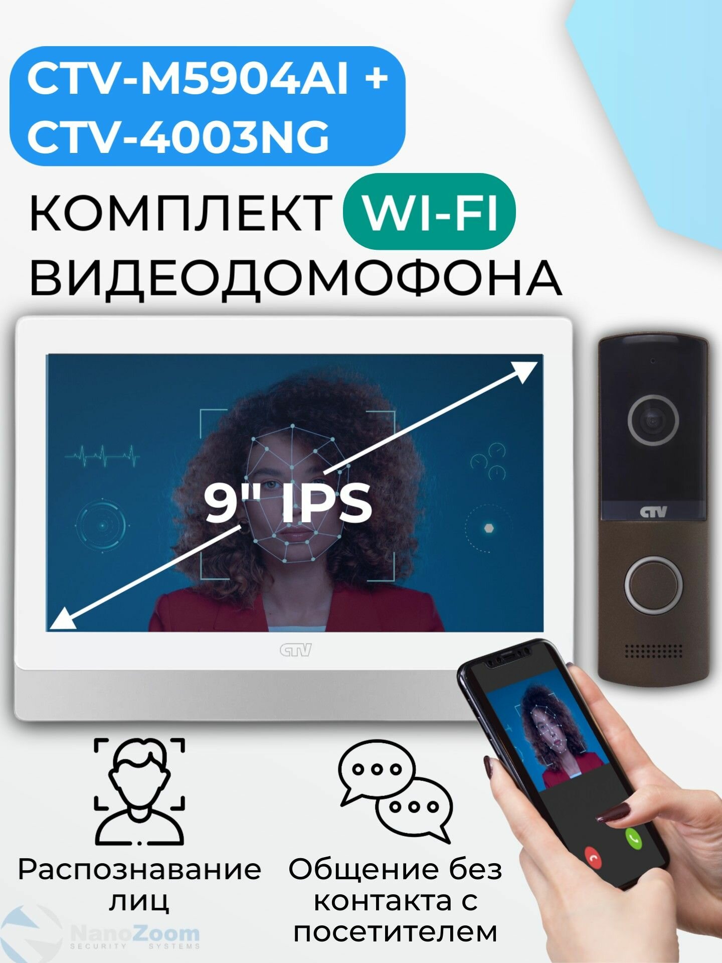 Комплект WiFi видеодомофон для квартиры: монитор 9″ CTV-M5904AI (W) + вызывная панель CTV-D4003NG (B), для дома или офиса, управление со смартфона, AI-функции, подключение к подъездному домофону
