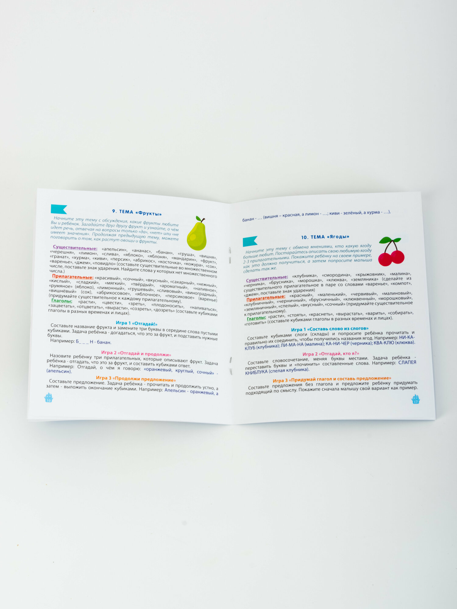 1. 16 кубиков с буквами и знаками препинания 2. 44 карточки с заданиями на понимания прочитанного 3. Рекомендации для взрослых с играми по 20 разным темам 4. Диплом