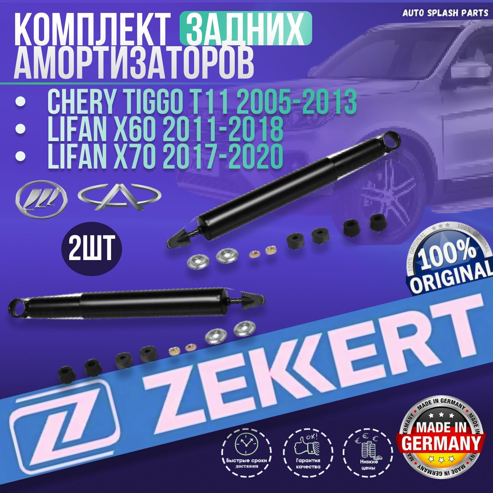 Купить Комплект задних амортизаторов Chery Tiggo T11 2005-2013, Lifan X60 2011-2018, X70 2017-2020 германия увеличенный ресурс (Чери Тигго Т11 Лифан Х60 Х70) Левый+Правый с доставкой по всей России.
