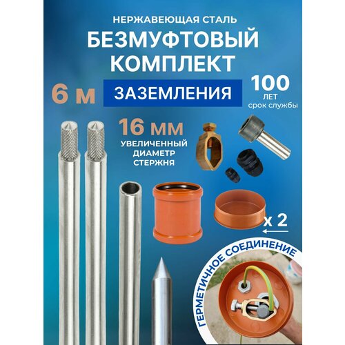Комплект заземления из нержавеющей стали предназначено для организации эффективного, долговечного и удобного в монтаже заземления в условиях повышенной коррозионной опасности (агрессивный грунт, повышенная влажность и т. п.). Комплект заземления состоит из стержней длиной 1,5 метра, выполненных из нержавеющей стали, соединение стержней происходит путем забивания одного стержня в другой (безмуфтовый способ), накатка на стержне не дает выйти стержням друг из друга, также в комплекте есть герметичный бокс для соединения стержней и заземляющего кабеля. При замере сопротивления у безмутового заземления оно меньше чем у муфтового. Преимущества заземления из нержавеющей стали: