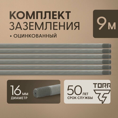 - Комплект заземления TORR-9 – позволяет смонтировать заземлитель на глубину до 9 метров. Комплект включает в себя 6 стальных оцинкованных стержней длиной 1,5 м. и диаметром 16 мм. вместе с необходимыми комплектующими. Наименование, количество и вес комплектующих отражены в разделе характеристики.