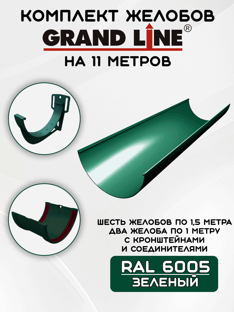 Комплект желобов водостока на 11 метров Grand Line зеленого цвета (120мм/90мм) RAL 6005: сравнение цен, характеристики, фото, актуальное наличие и цены.