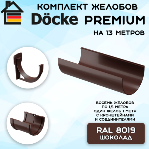 Купить Комплект желобов водостока на 13 метров Docke Premium цвета шоколад (120мм/85мм) RAL 8019 с доставкой по всей России.
