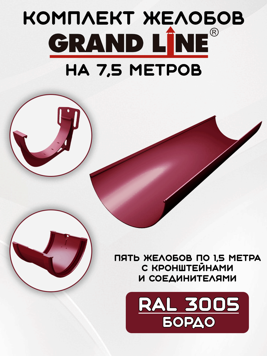 Комплект желобов водостока на 7,5 метров Grand Line бордового цвета (120мм/90мм) RAL 3005: сравнение цен, характеристики, фото, актуальное наличие и цены.