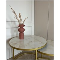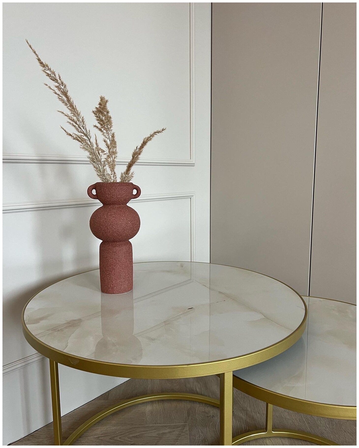 Комплект из 2-х журнальных столов вставного типа ONIX. Малый стол частично вставляется под большой стол. Столы могут использоваться самостоятельно друг от друга. Размеры:- Большой стол - диаметр 60 см, высота 45 см,- Малый стол - диаметр 45 см, высота 40 см. Основание: металлический профиль, сечение 15/15 мм. Цвет основания: золото матовое. Материал столешницы керамогарнит ONIX, имитирующий факутру камня, гялнцевый. Керамогранит - красивый и прочный материал, имитирующий фактуру мрамора. Устойчив к царапинам, пятнам. Рисунок столешницы различается в каждом конкретном изделии ввиду уникальности и неповторимости материала. Рекоммендации по уходу: уборка влажной тряпочкой без использования агрессивных моющих средств.