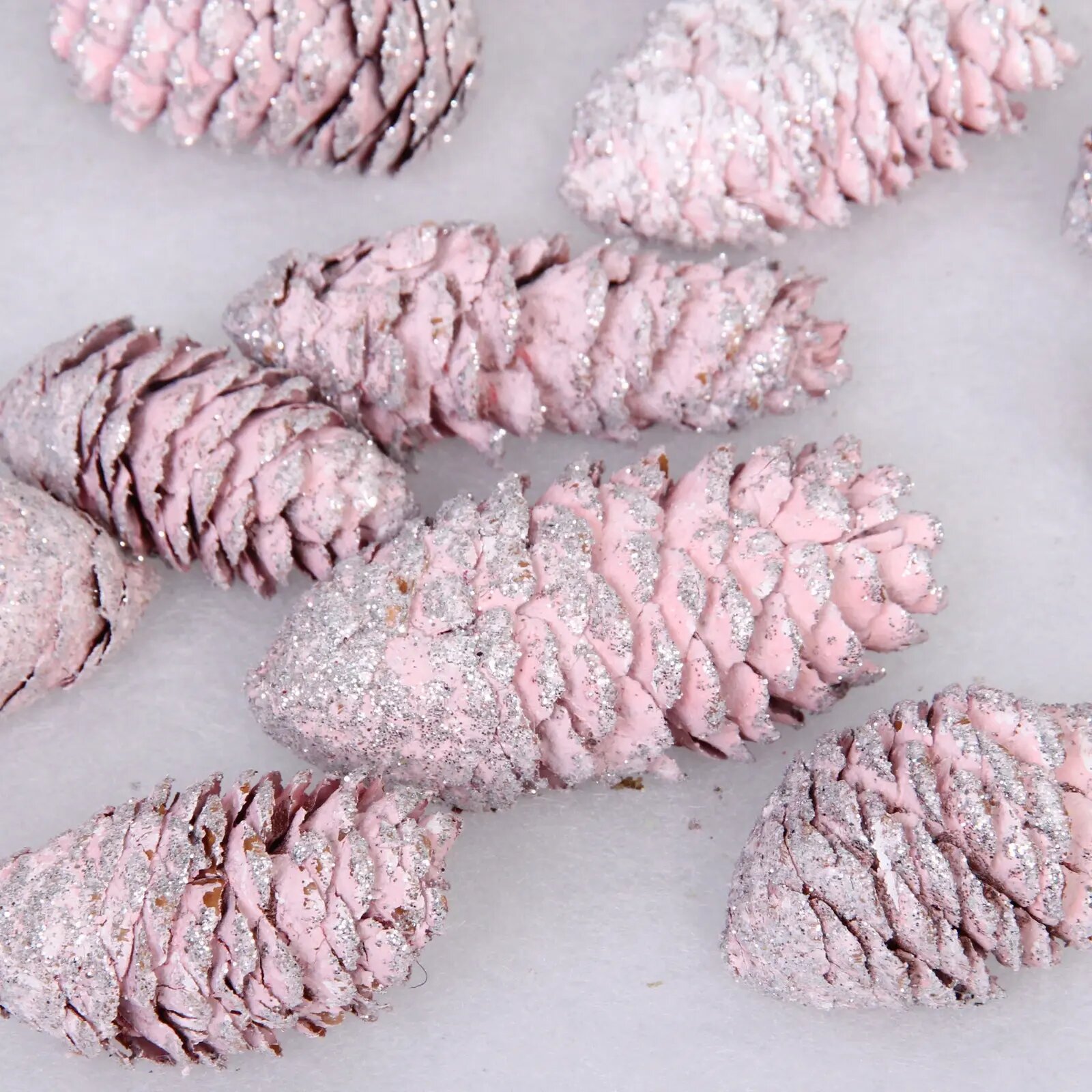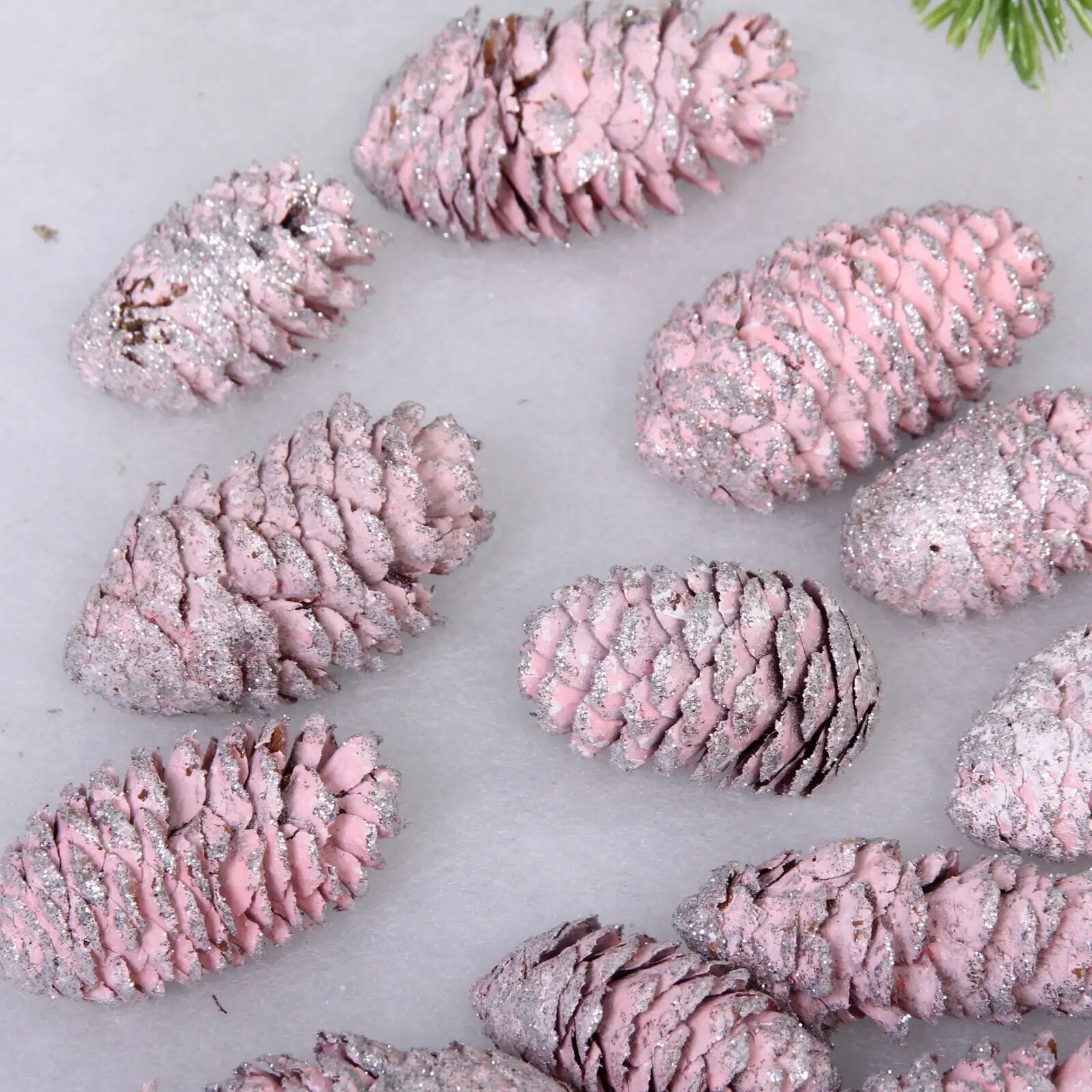 Искусственные шишки с блестящей поверхностью, имитирующей блеск. Размер упаковки 10*10*13 см, вес 120 гр, цвет розовый.