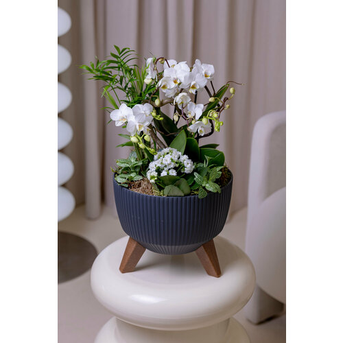 Купить Композиция «Цветочная Гармония» с живыми орхидеями в кашпо на ножках Margo plants с доставкой по всей России.